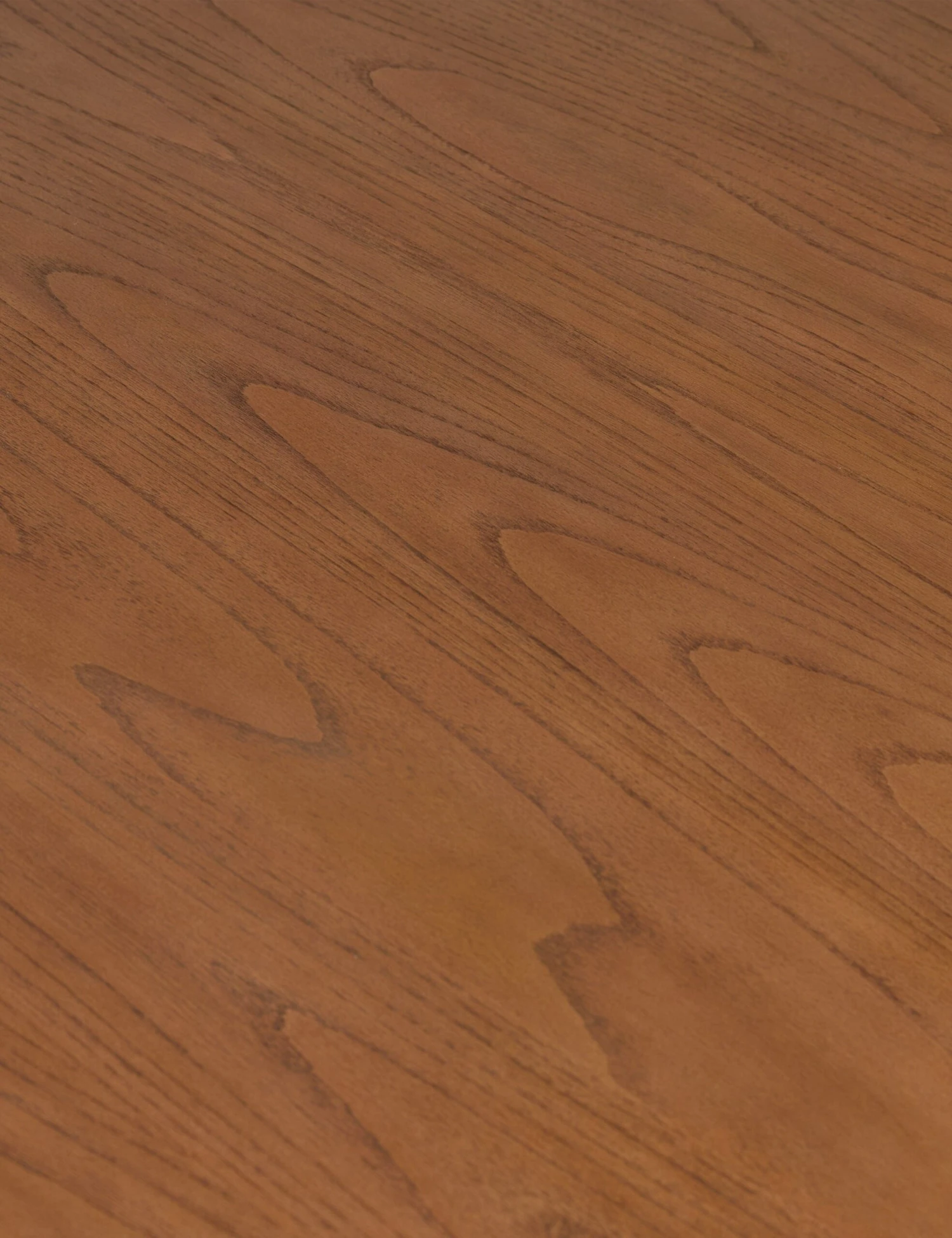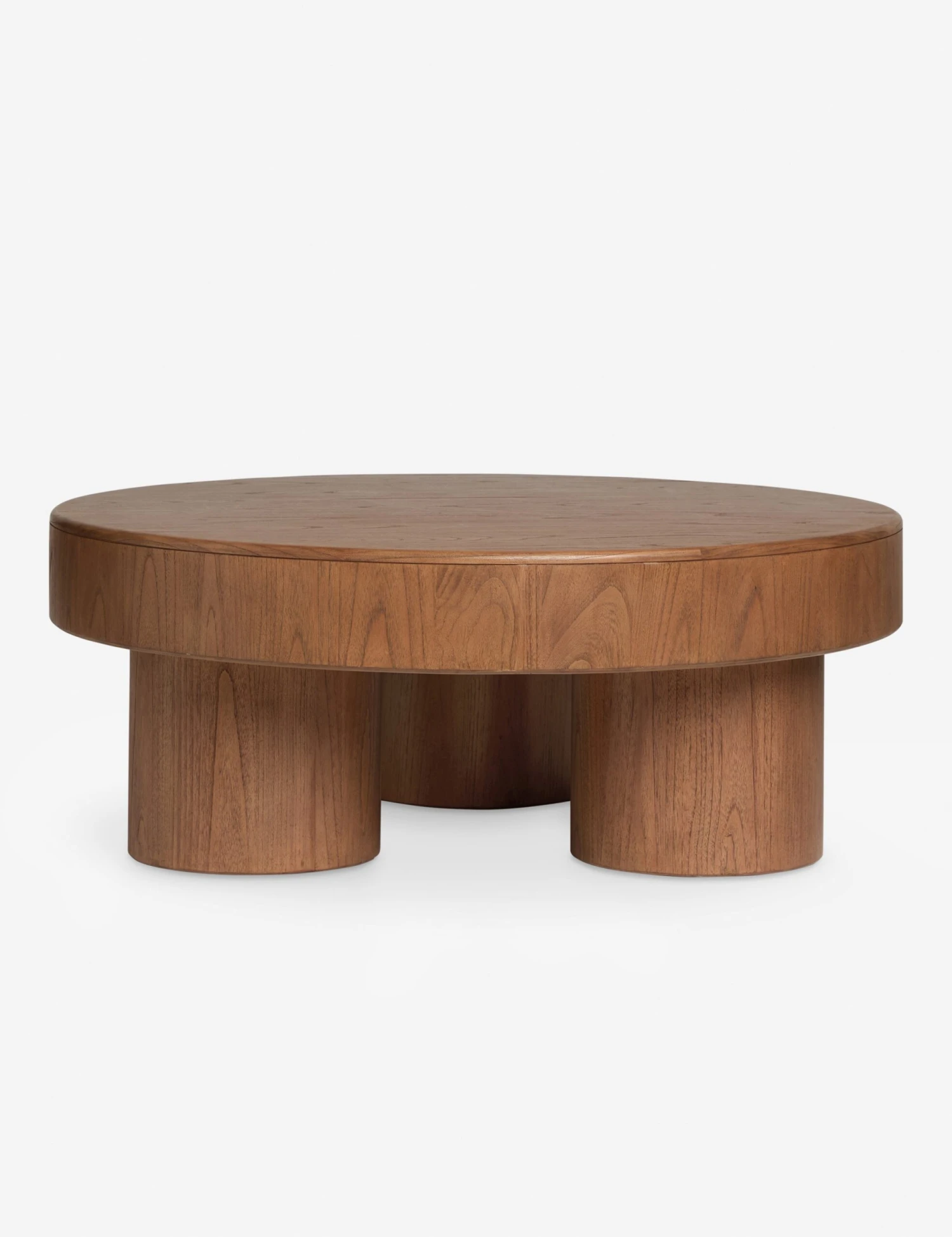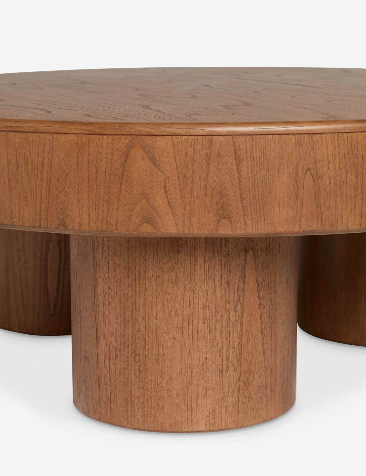 Bold in profile with soft lines, this round coffee table makes a grounded statement in any living space. Thick pillar legs bring sculptural weight, balancing natural grain detail with a modern form. This wood coffee table’s rich finish creates presence and impact, imbuing a sleek, organic tone.