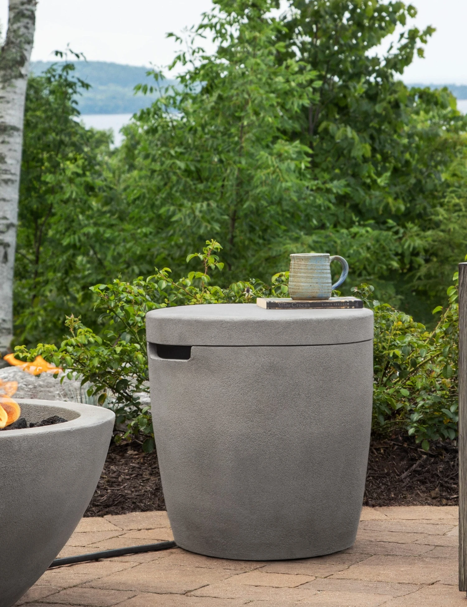 Complete your patio look with a concrete cover made to match your fire table or bowl. This concrete cover discretely conceals a 20-pound propane tank and doubles in transforming your fire pit into an accent table, offering style and functionality to your outdoor lounge.