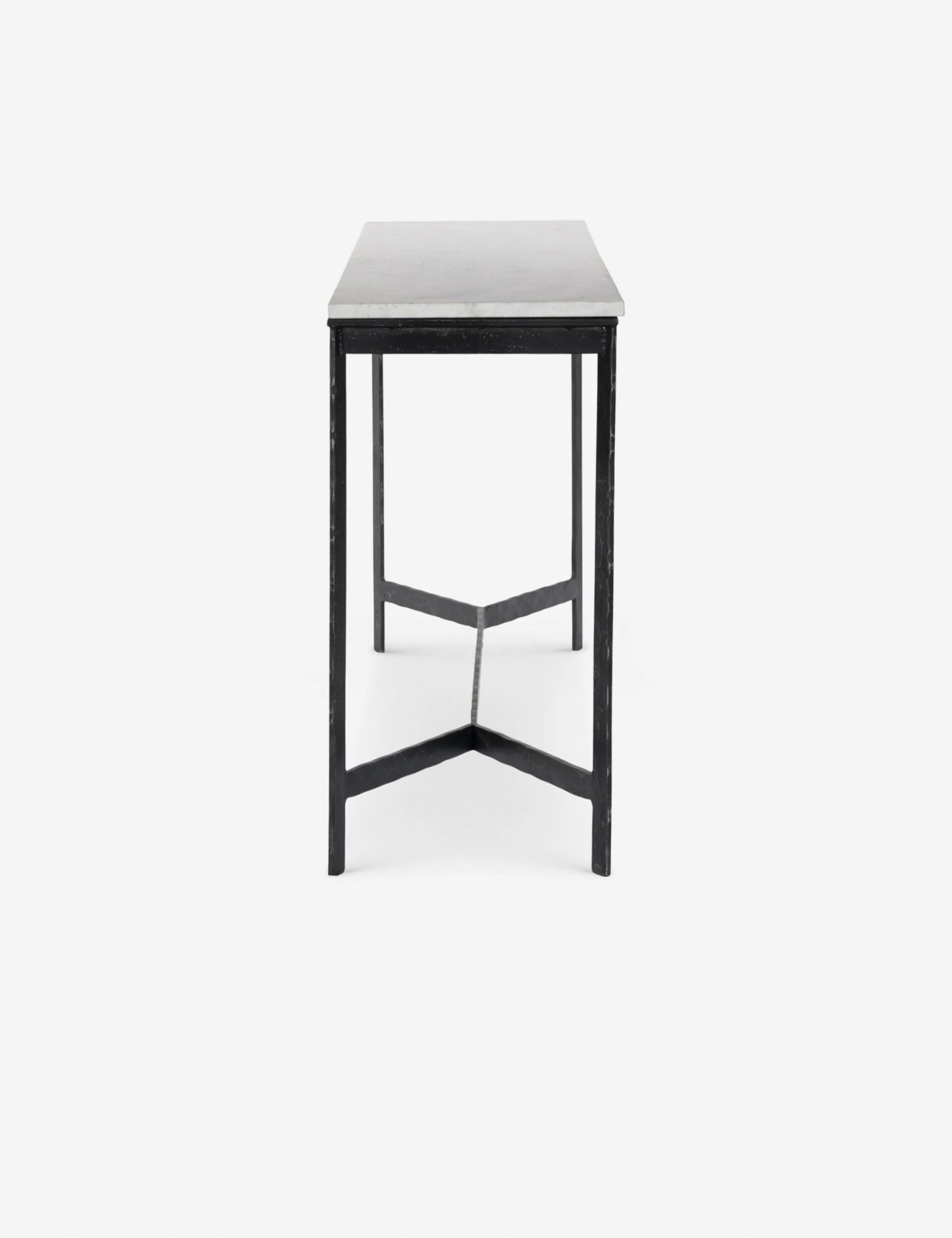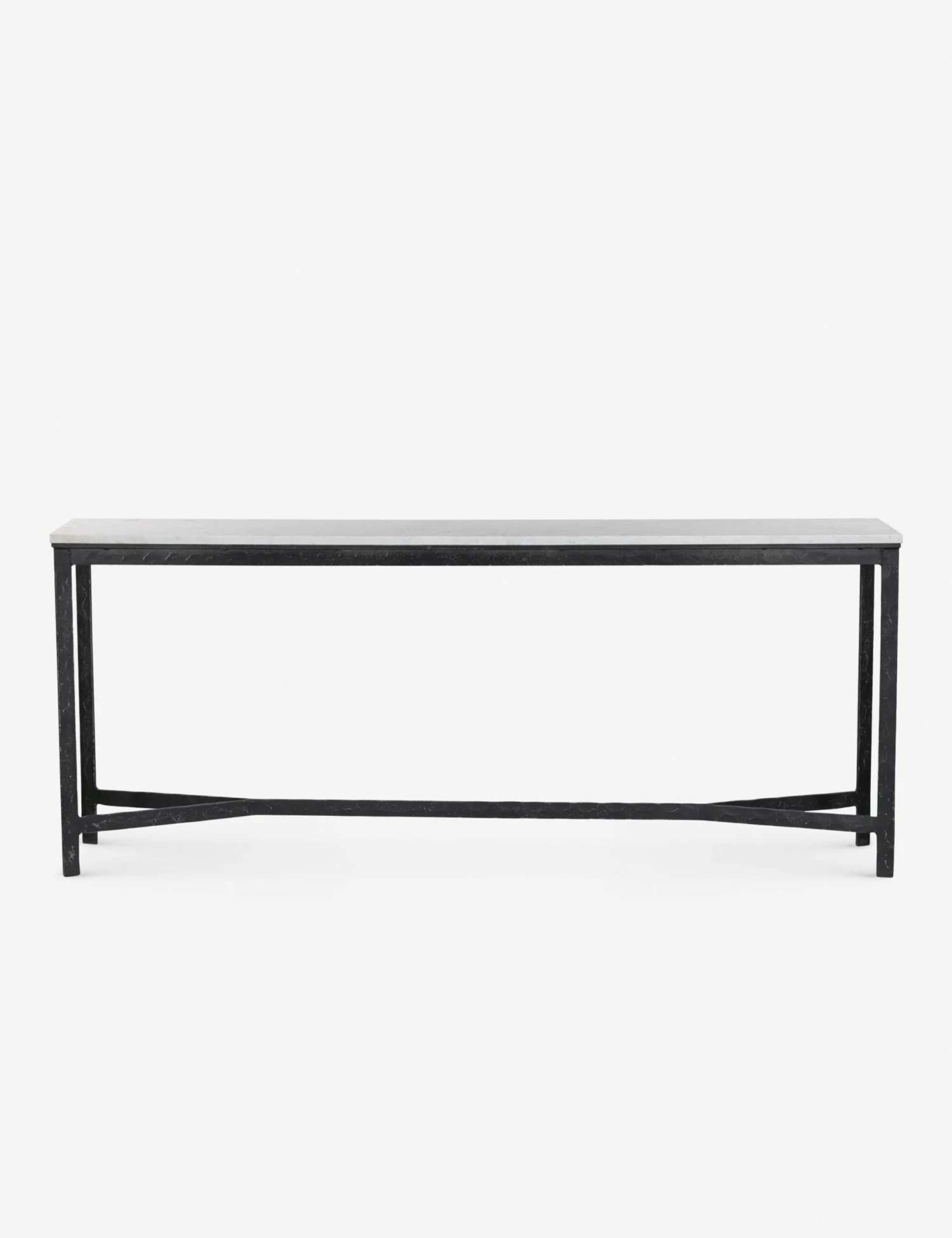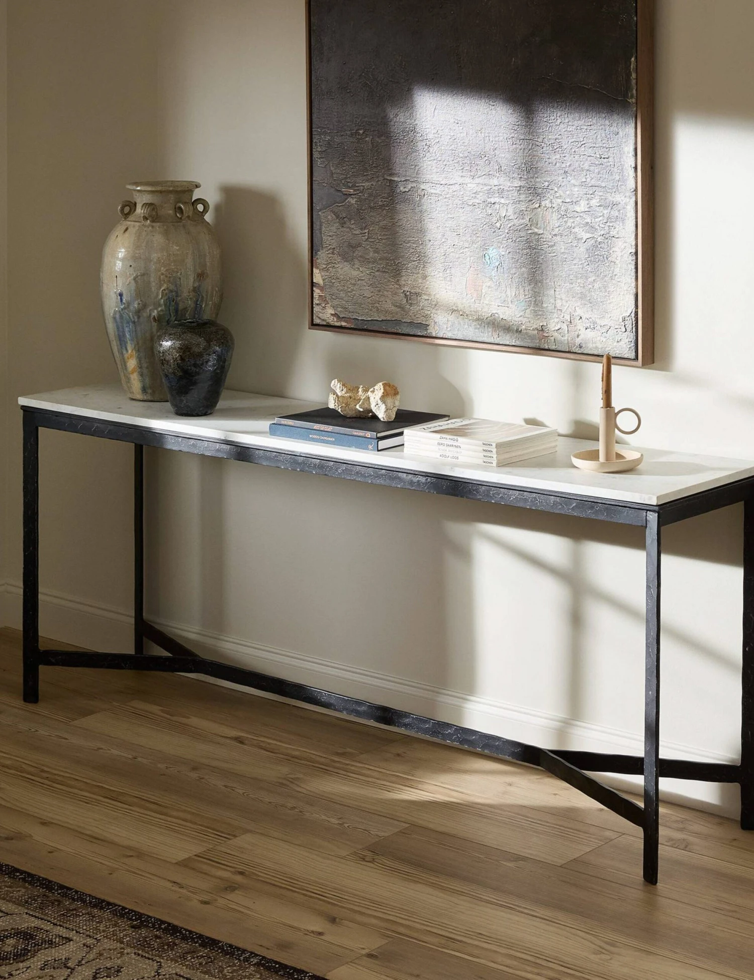This modern console table pairs a polished white marble top with a hammered iron base for a luxe contrast. The slender frame and cross-stretcher bring a touch of architectural elegance, while the refined material mix elevates the look. A versatile console table for an entryway or living space, this piece styles a graceful silhouette with a hint of glamour.