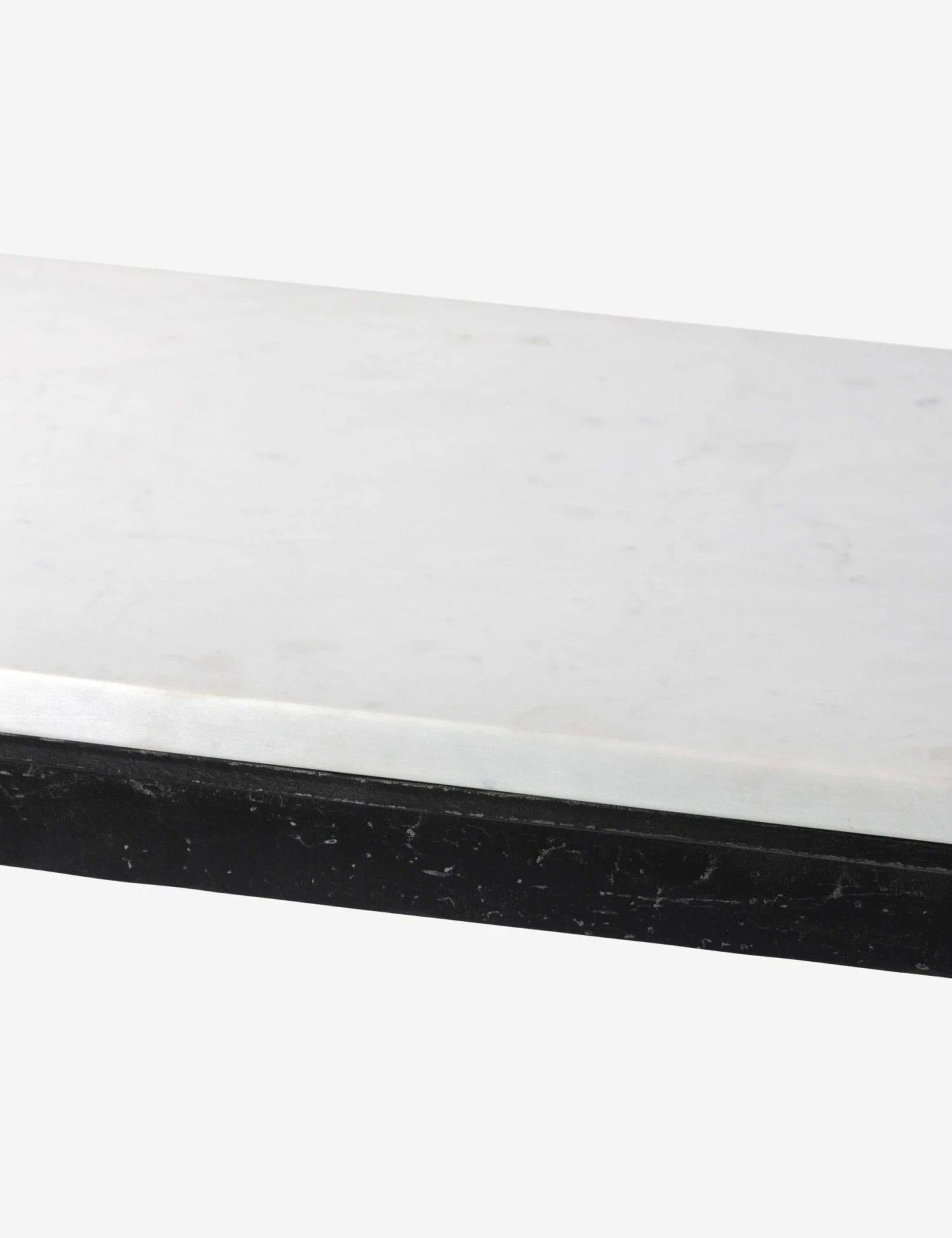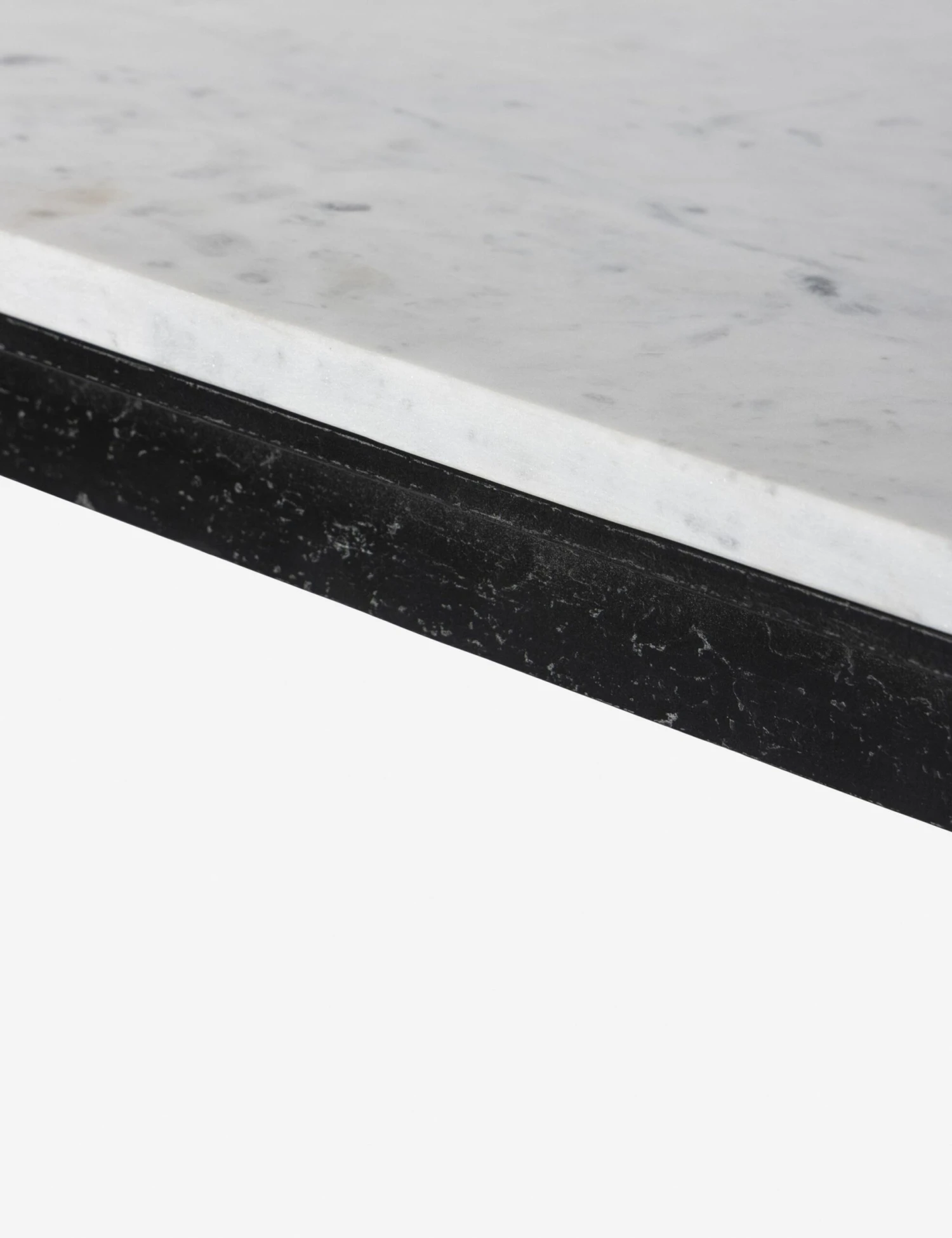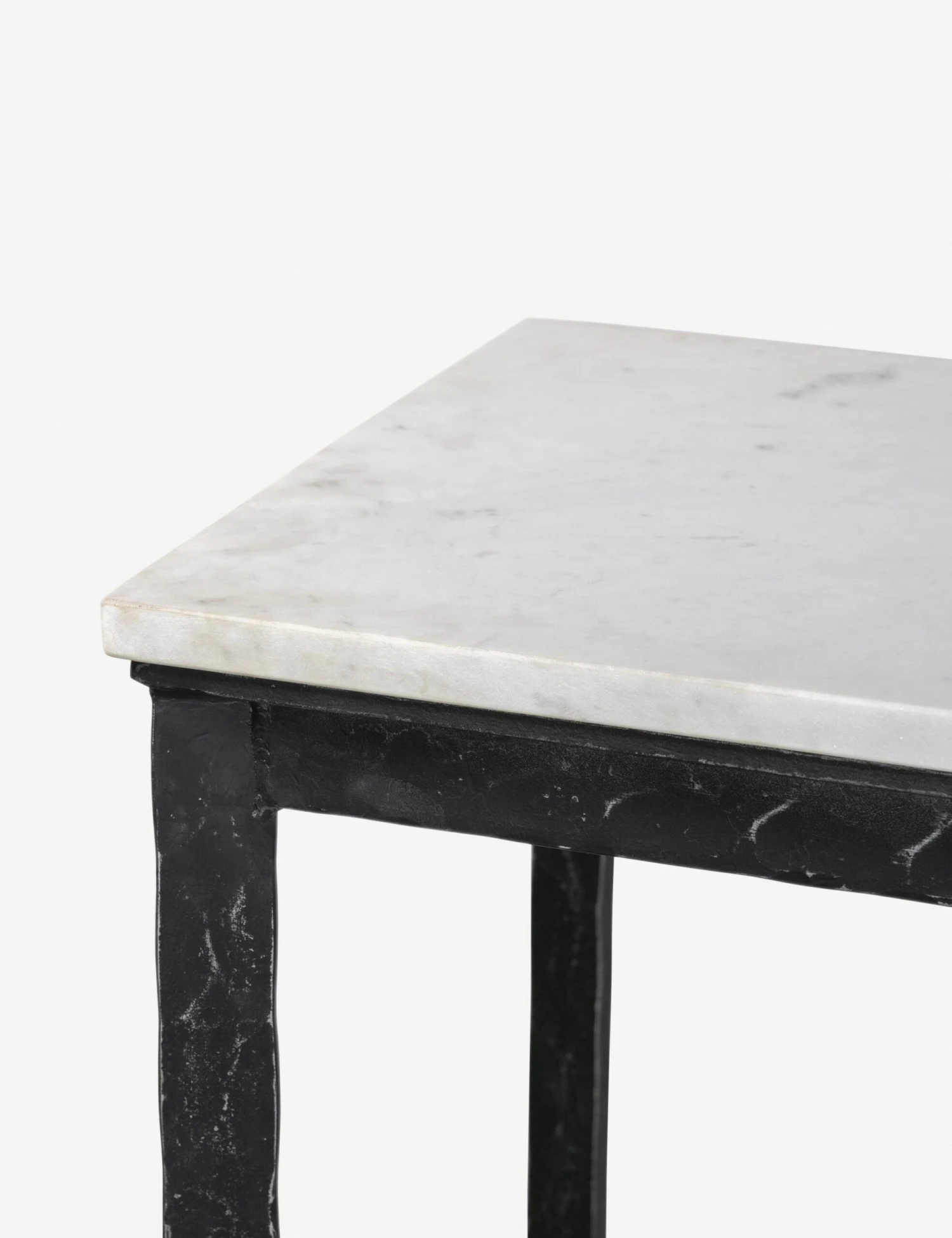 This modern console table pairs a polished white marble top with a hammered iron base for a luxe contrast. The slender frame and cross-stretcher bring a touch of architectural elegance, while the refined material mix elevates the look. A versatile console table for an entryway or living space, this piece styles a graceful silhouette with a hint of glamour.