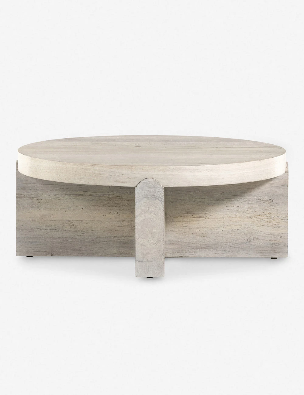 A sun-bleached oak veneer offers refined tones to the rustic splendor of this chunky wood coffee table. The round top is fashioned to fit on a cross-style base, grounding this coffee table with a sturdy, sculptural silhouette.