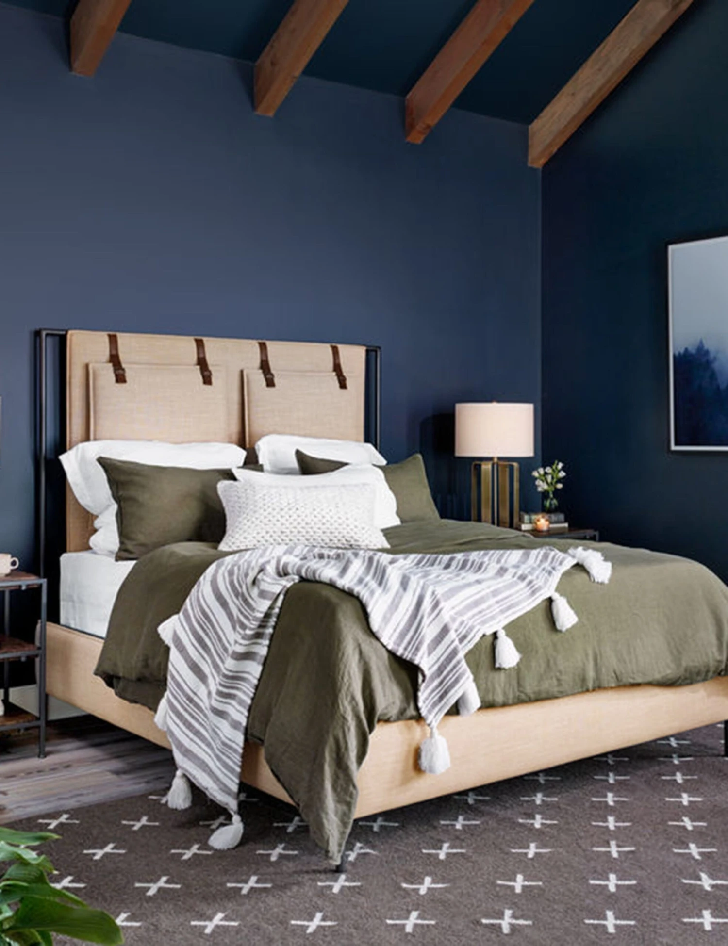Textured linen upholstery brings a softer look to this industrial-inspired iron bedframe, complete with brown leather straps to secure the headboard’s decorative suspended pillows.