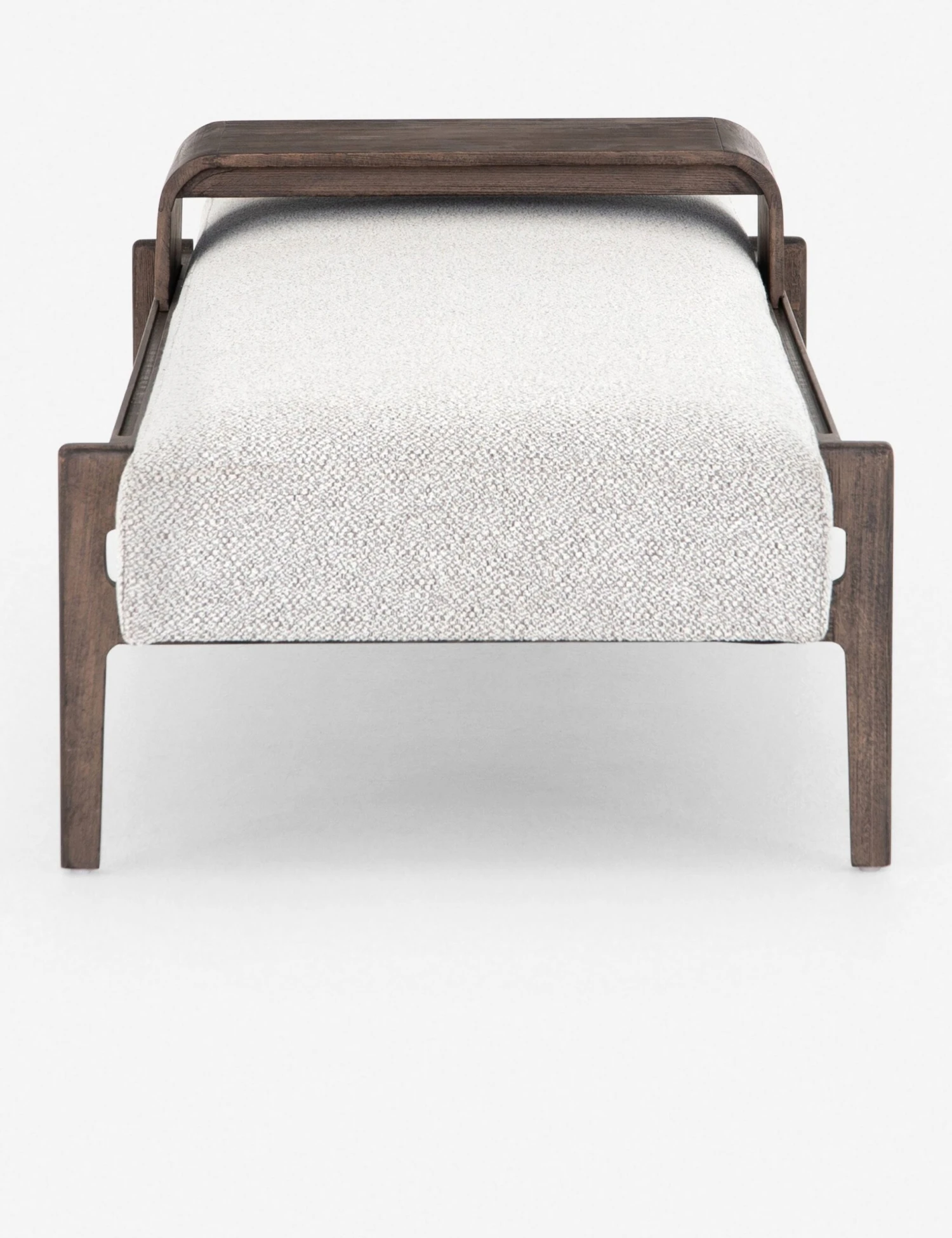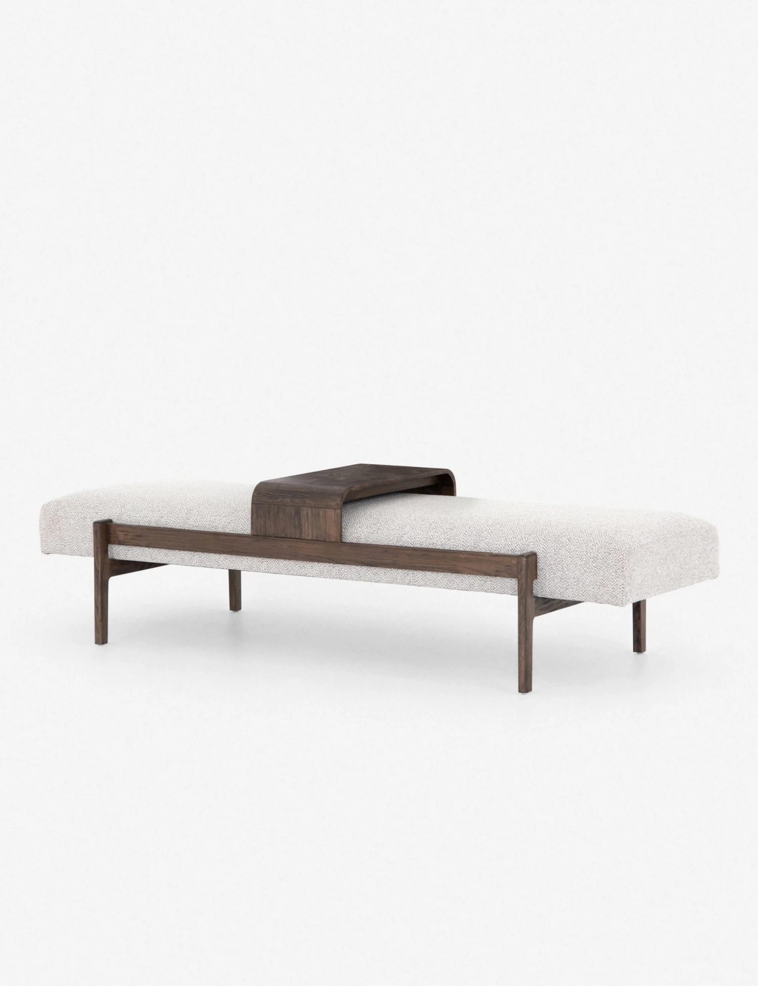 Distinctly modern with a sculptural look, this wooden bench is the perfect artful statement piece for your entryway, living room, or bedroom. The slim wooden frame supports a long fabric cushion, with a wraparound piece that’s both a design element as well as a functional tabletop.