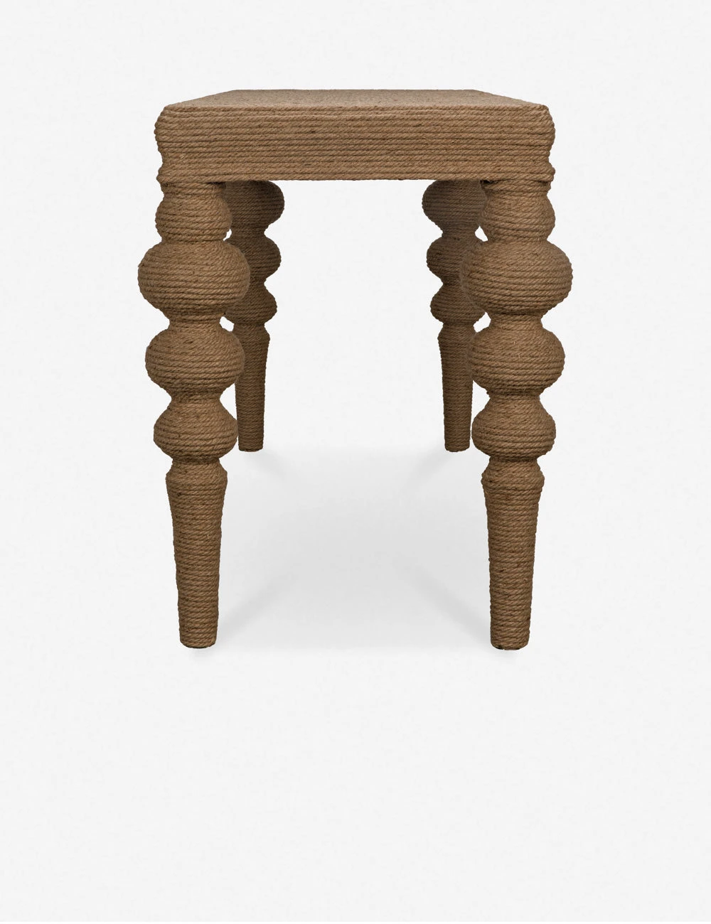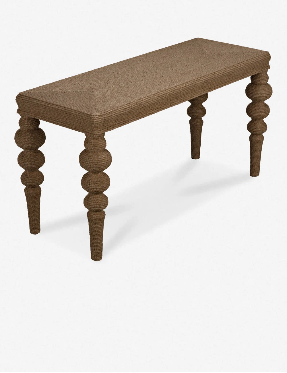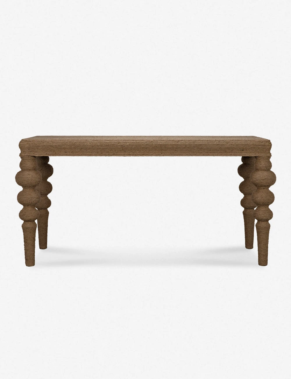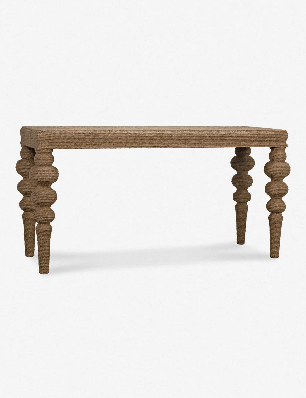 A traditional console silhouette features a solid elm construction with turned legs all wrapped in rope for timeless appeal with a textural twist. This tactile sofa table offers the perfect layer of artisan character to ground your living room or entryway decor.