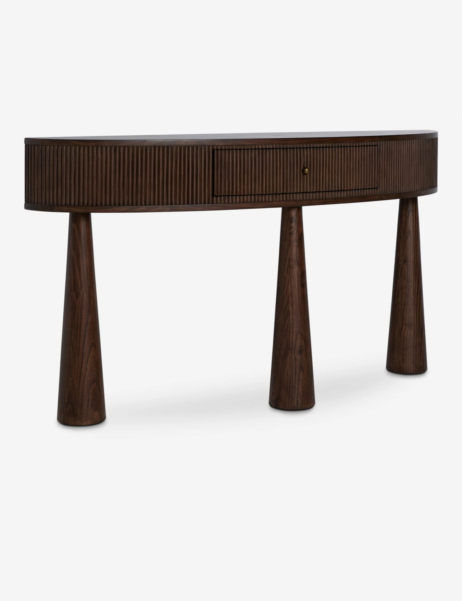 Natural grain texture takes a sculptural turn in our Fletcher console table. The modern silhouette is defined by its chunky tapered legs and a crescent-shaped top with fluting along the sides. With its sturdy bearing and a drawer for added storage, this unique console table is the perfect way to set the tone for an artful edit, whether in your entryway or living room.