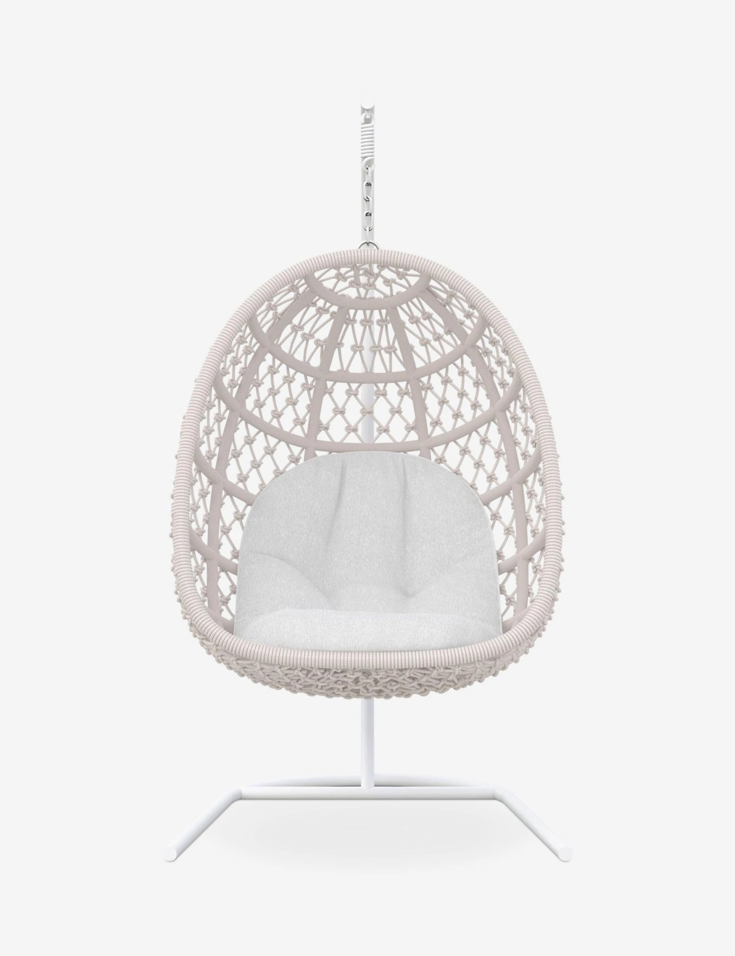 The Gibbs indoor/outdoor hanging chair balances practical comfort with breezy sophistication. From the light but sturdy aluminum underneath to the all-weather rope and removable, performance fabric cushion, every element is designed to bring effortless elegance to indoor-outdoor living. This swinging chair features an airy, egg-shaped seat suspended from a gently curving arm—finished in rope with hand-knotted detailing.