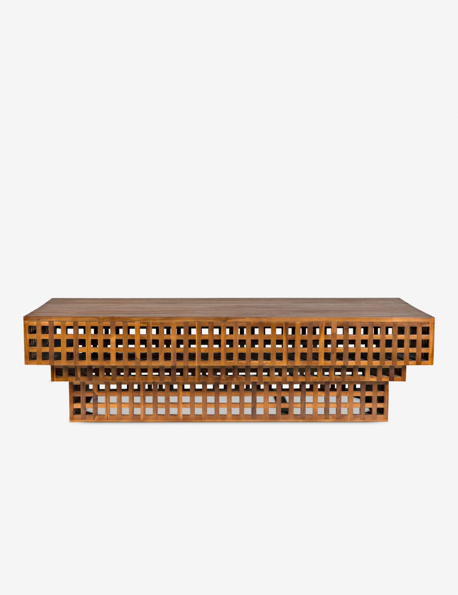 The Joffe coffee table features a stacked box silhouette crafted from teak to create a chic open grid pattern that brings texture and depth to your space. A clear coat finish allows the warmth of the wood and the coffee table’s design detail to take center stage.
