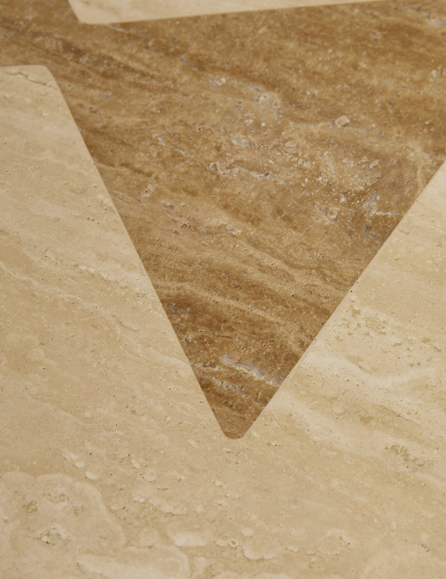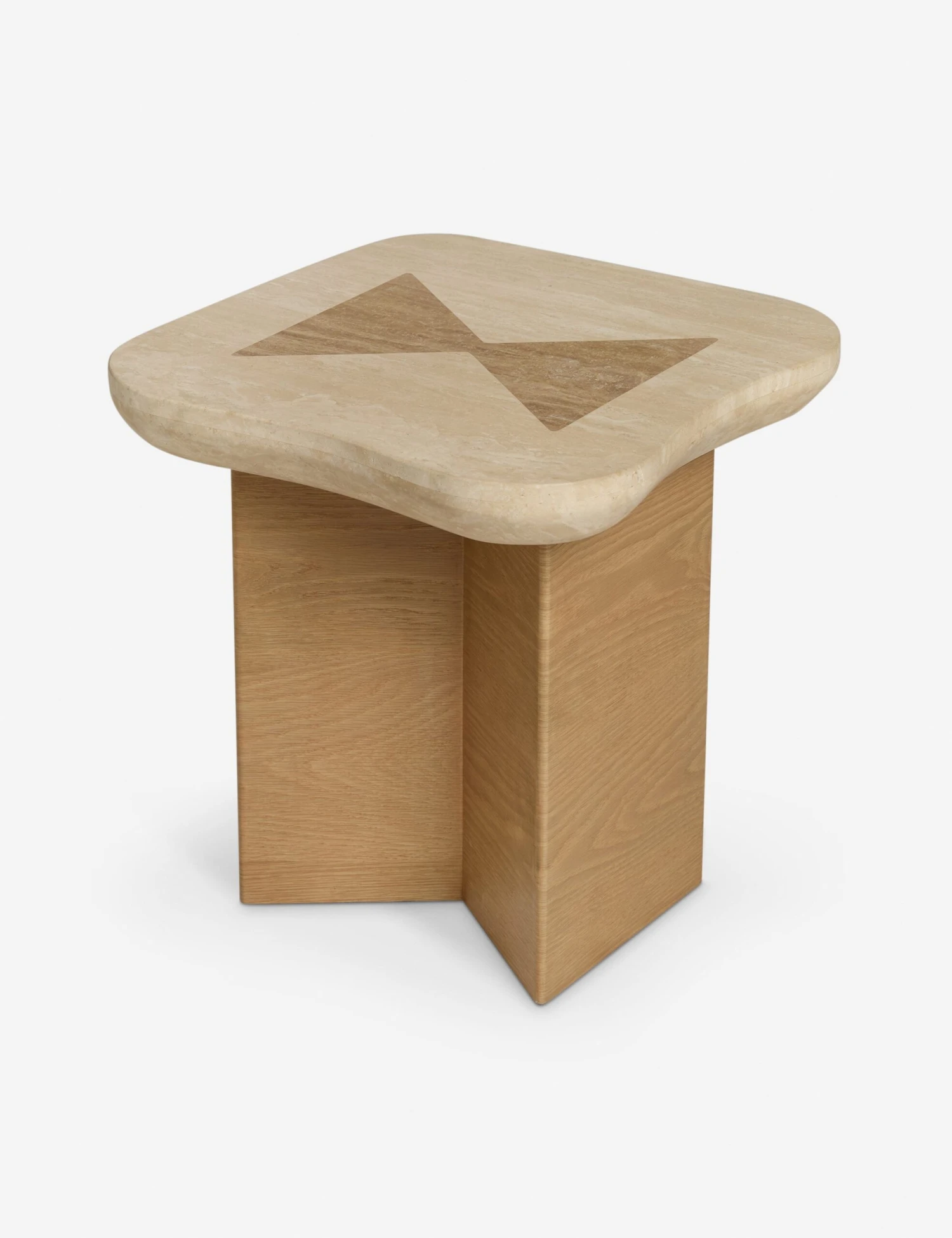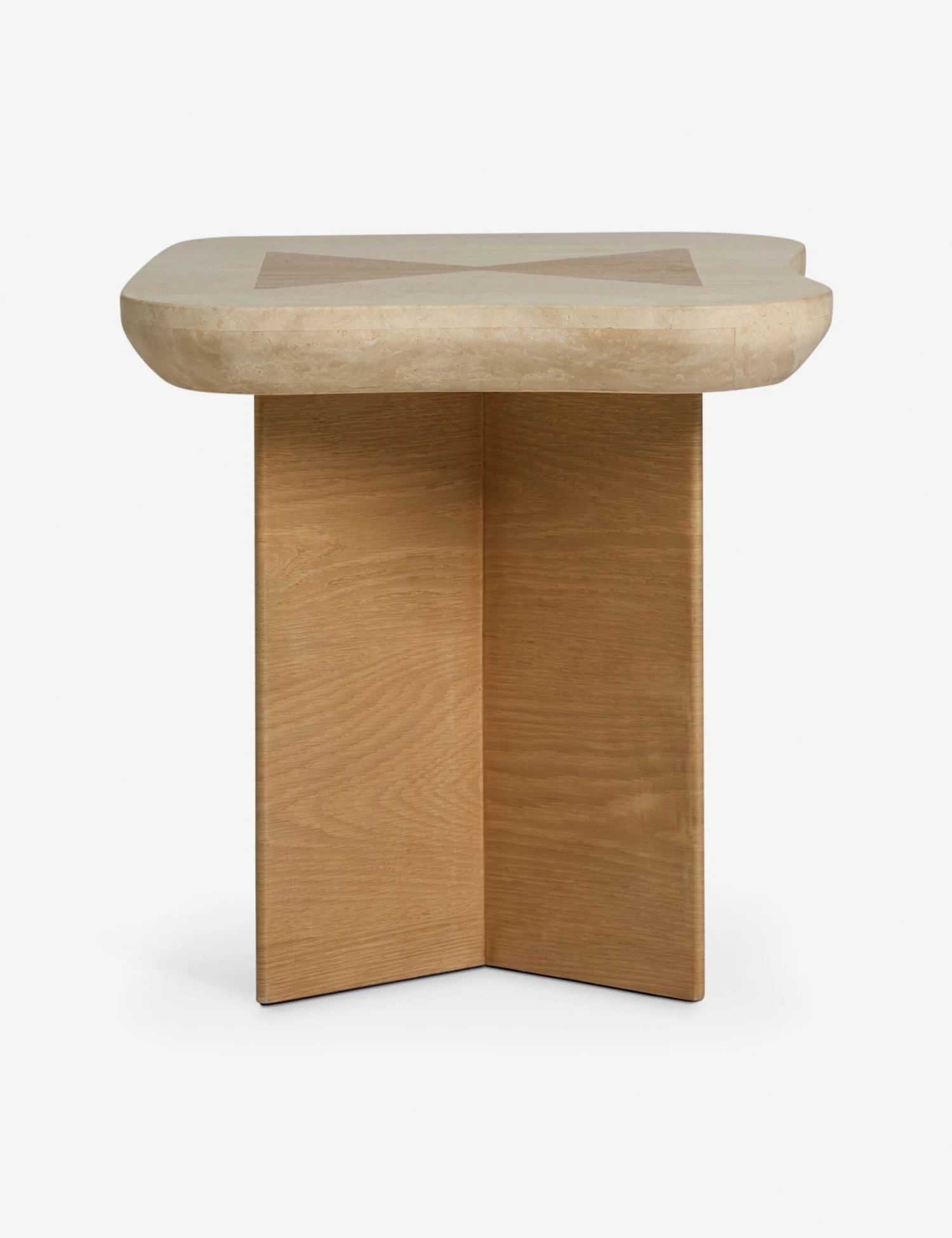 The Kanto side table plays with modern form and material contrast. A boxy wood base reveals beautiful grain beneath a travertine-style top, where organic edges and an inlay add texture and warmth. This small side table is from our exclusive Sarah Sherman Samuel collaboration and features all the trademarks of her warm, edited style.