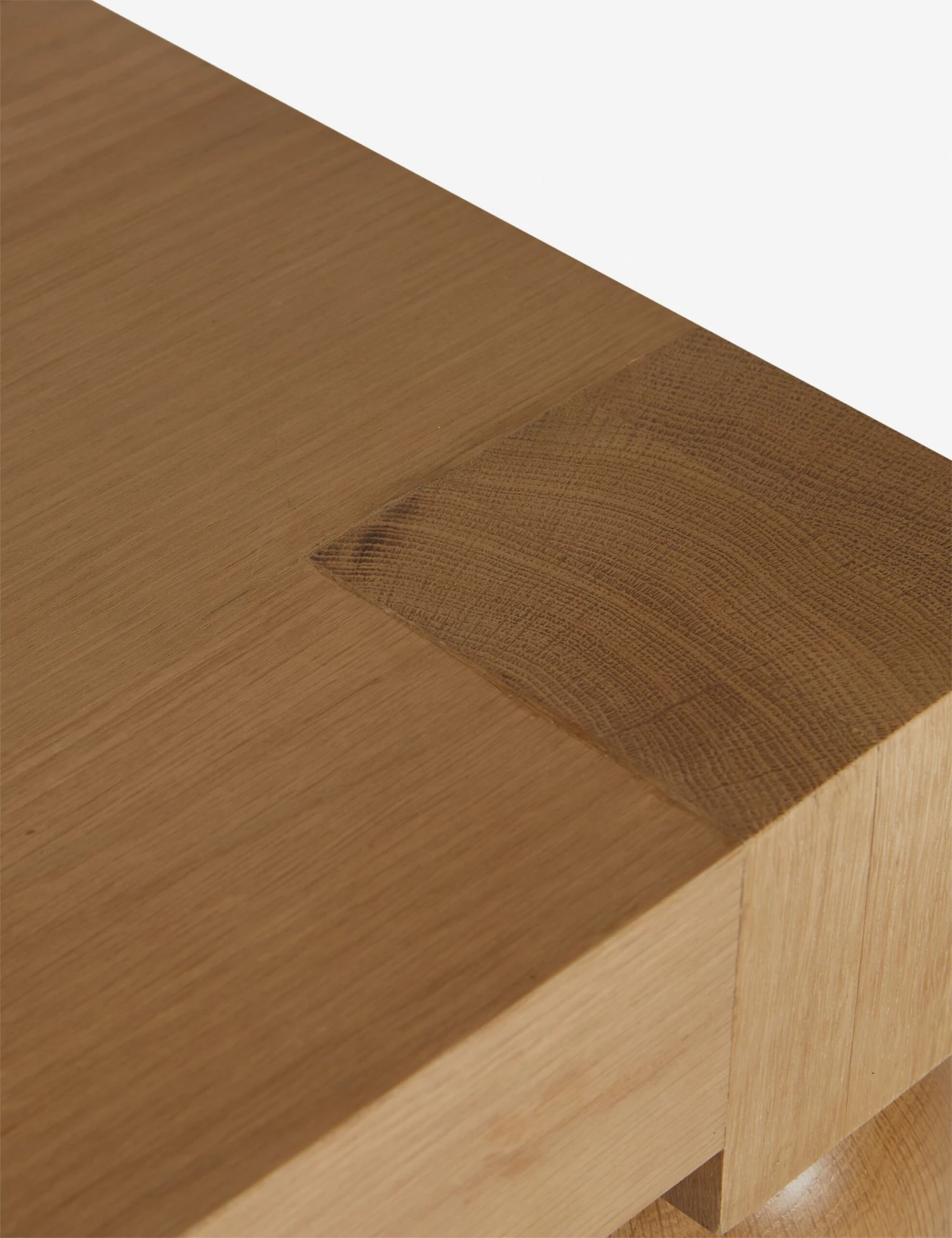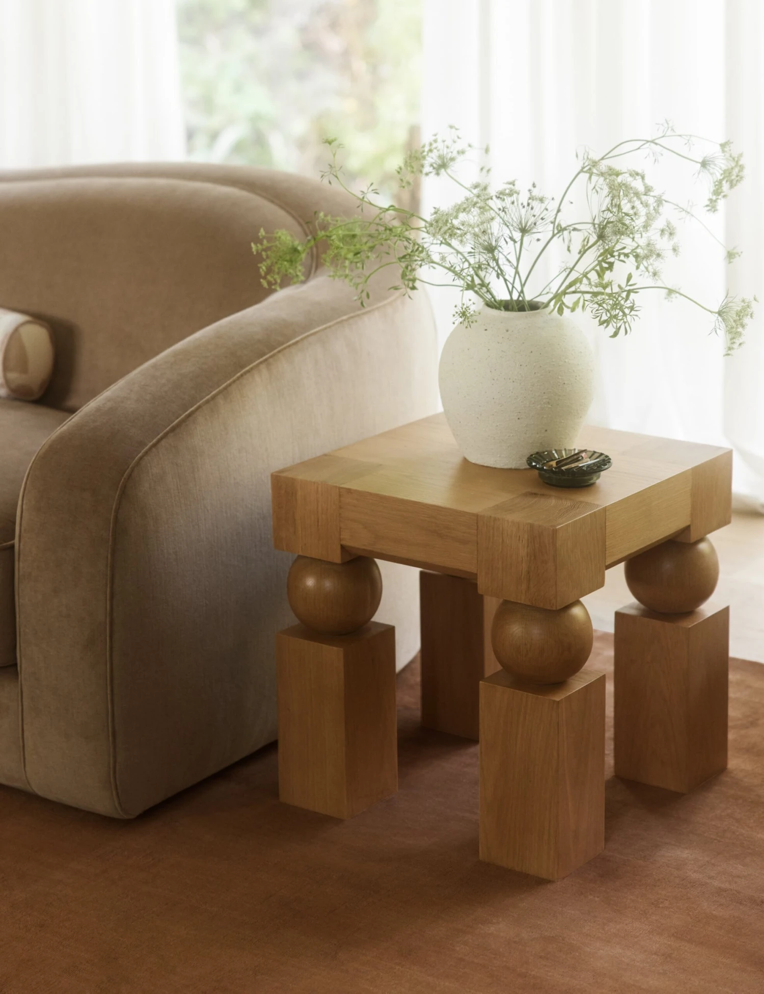 The Kent side table offers a sculptural edge to any living space. Its blend of geometric shapes cuts a sculptural silhouette in oak—fashioning the perfect end table for a modern yet grounded design.