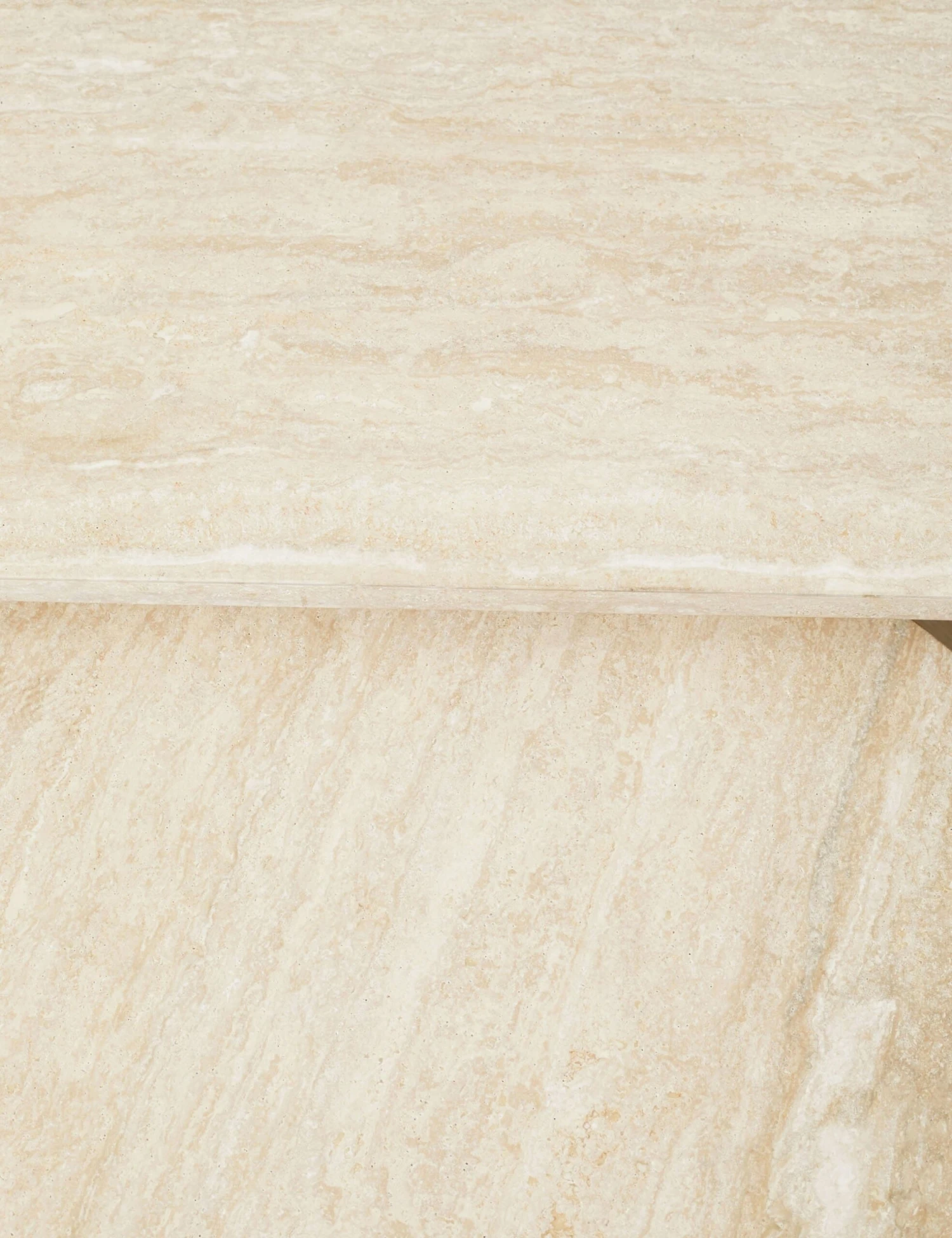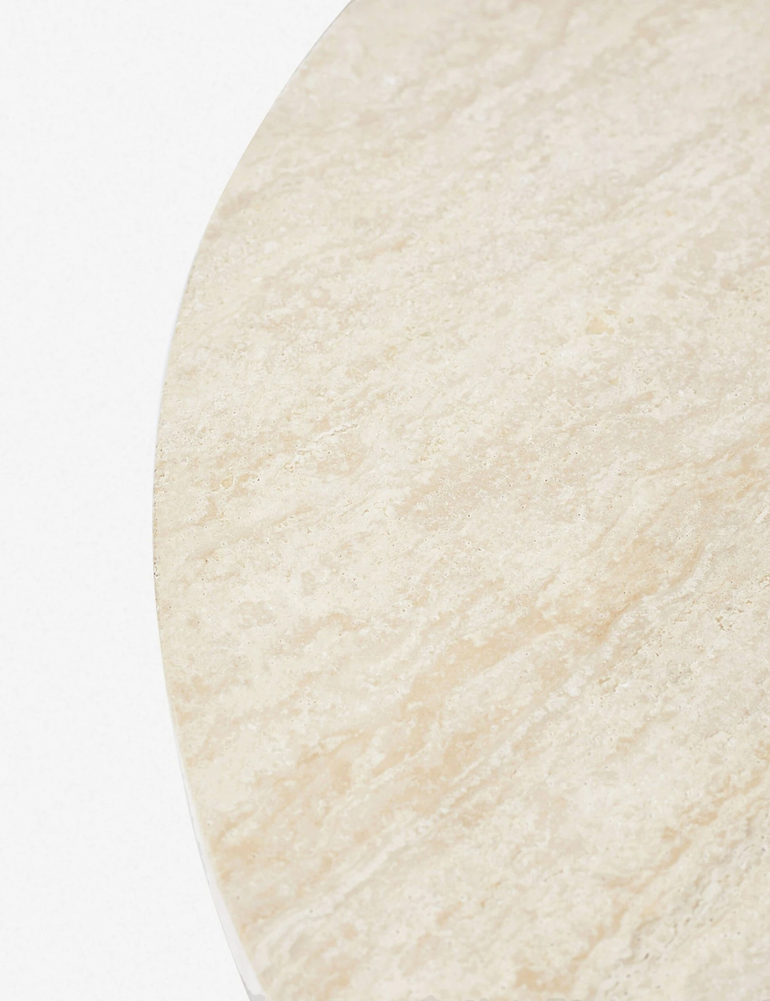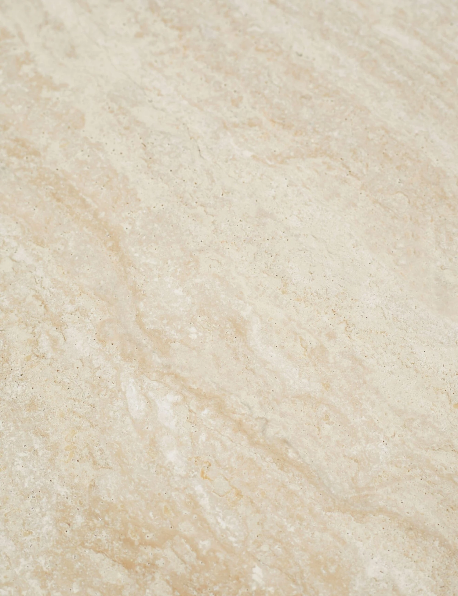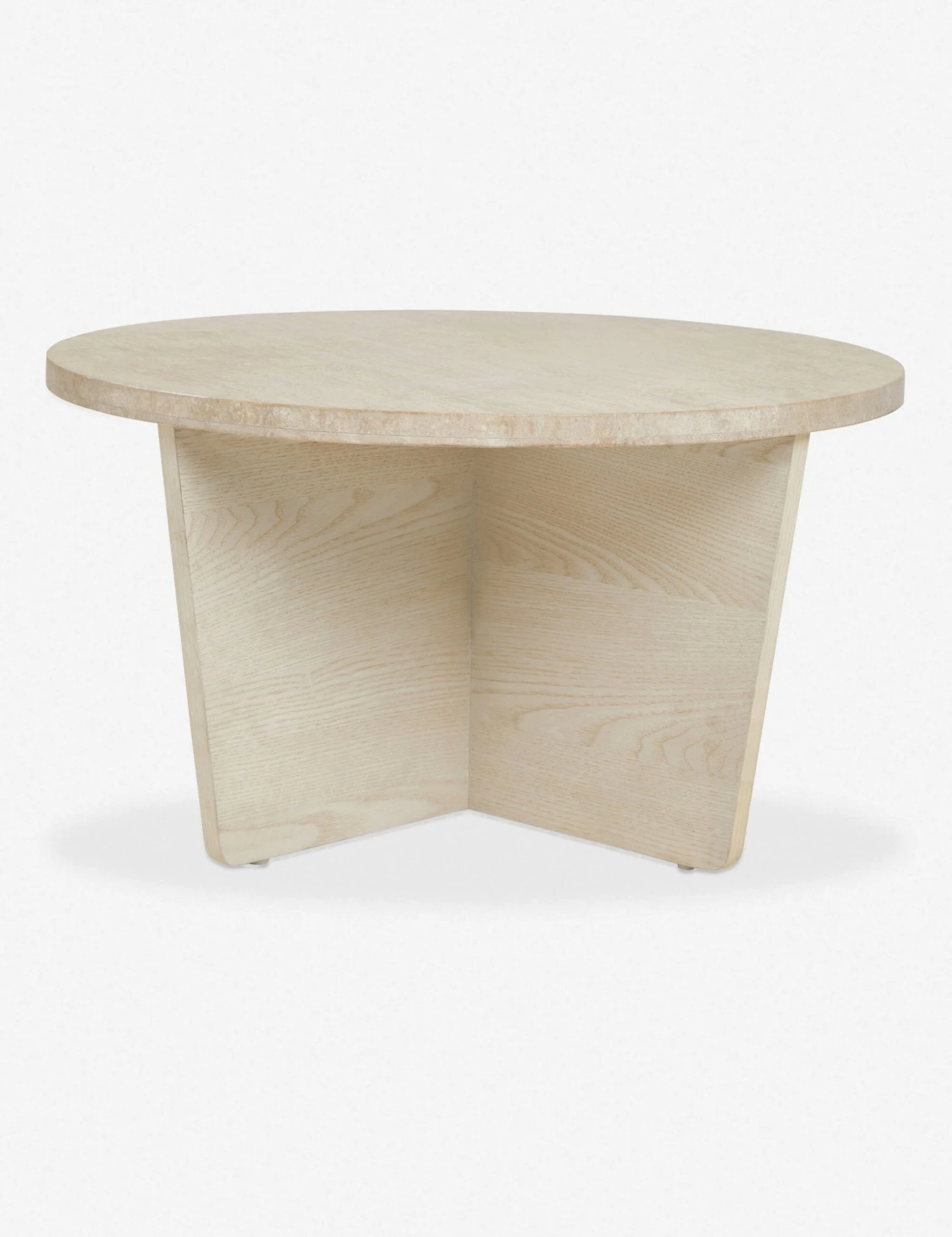 Architectural shapes stunningly highlight the natural materials of ash wood and travertine with this round coffee table. The warm, earth-toned coloring of the travertine top provides a soft, tonal contrast to its x-shaped ash veneer base.
