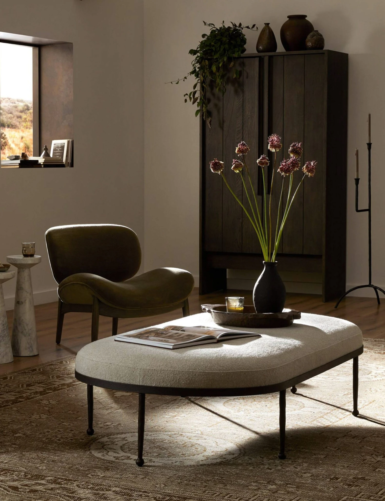 The Letlow ottoman brings a refined edge to your space with just the right touch of texture. A hammered iron base and rich upholstery nod to classic design, while the pared-back silhouette keeps it effortlessly modern. Sleek and understated, this cocktail ottoman offers seating or surface space with a stylish edge.