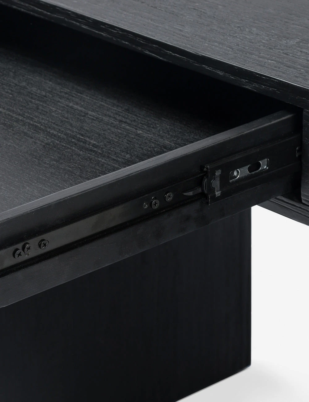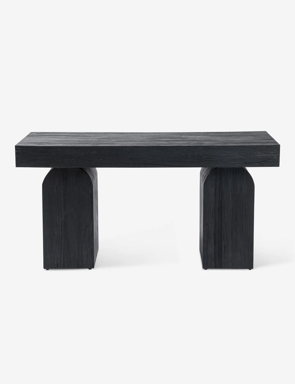 Elemental shapes create an architectural silhouette in this modern desk design. Fashioned from solid elm pieces with beautiful knotting and rich natural grain, two chunky arched legs hold a thick rectangular desktop featuring an inset drawer for sleek storage.