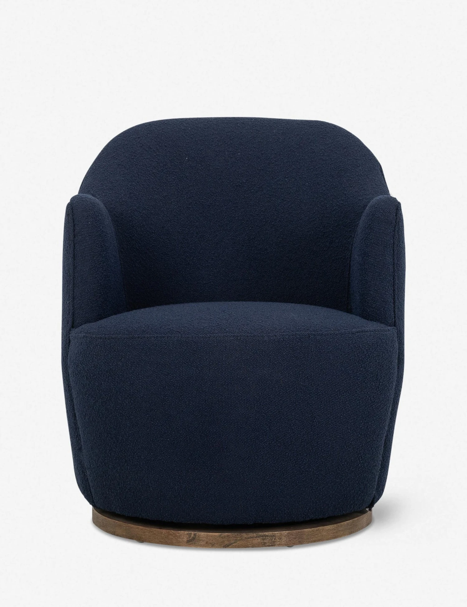 Nubby fabric on the Margie Swivel chair creates an invitation to cozy up and sit. A circular shape makes for a unique piece, and a wooden swivel base allows for conversation in any part of the room.