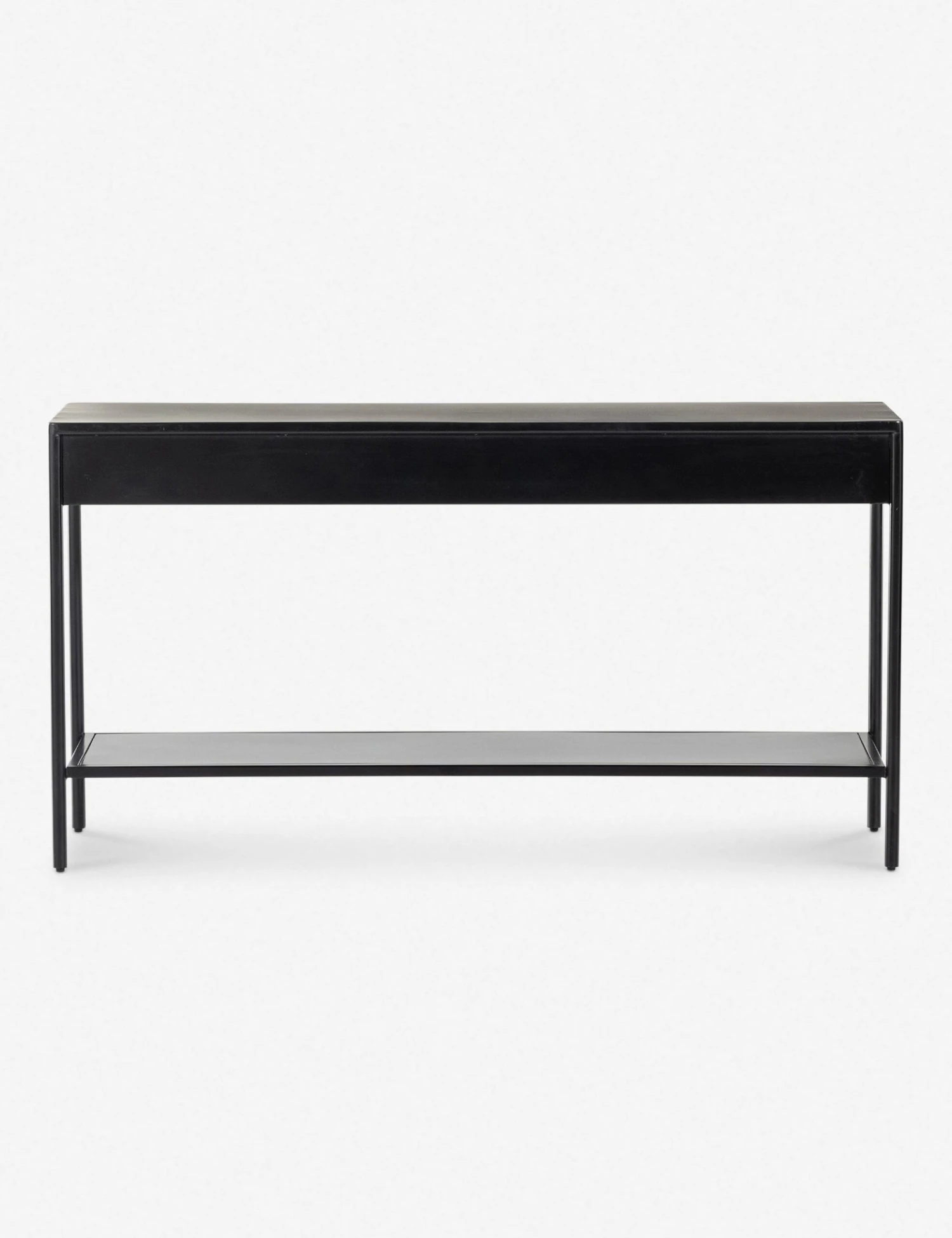 Blending sleek style with industrial undertones, this black-finished iron cabinet casts a clean, spare silhouette with bronzed hardware for modern appeal. Two drawers and a lower shelf offer a practical touch for a living room or entryway table.