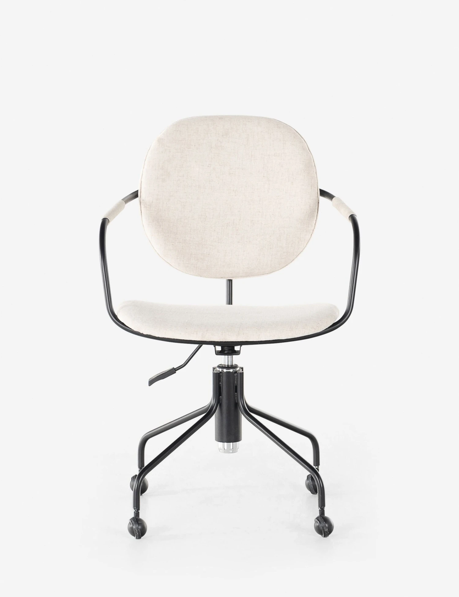 A bright, modern design with crisp, clean lines and cream-colored upholstery. We love this chair for its airy profile and versatility. Set on a black-iron swivel base with casters for practical use in a fresh, charming office space.