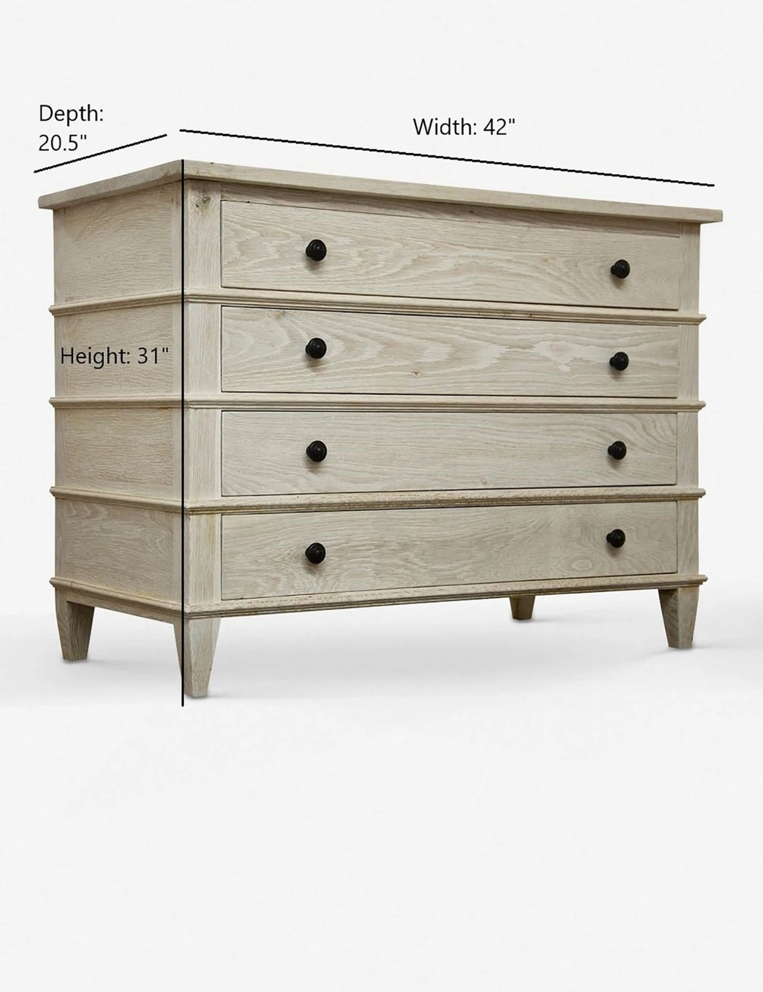 The Moriah dresser makes versatility look effortless and stylish. The four shallow drawers are framed with bevel detailing for a traditional look while the washed oak finish gives the piece that antique feel. The perfect size for a bedside chest or an entryway console, this piece can be styled almost anywhere in your home.