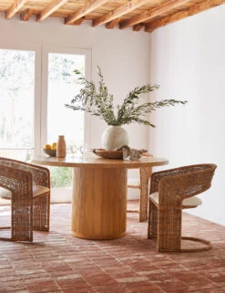 Strike a balance between natural texture and modern design with this round wood dining table. Its oak veneer showcases a beautiful grain while the round pedestal base is offset for a sculptural edge. Style this table with a set of clean-lined chairs to complete the look.