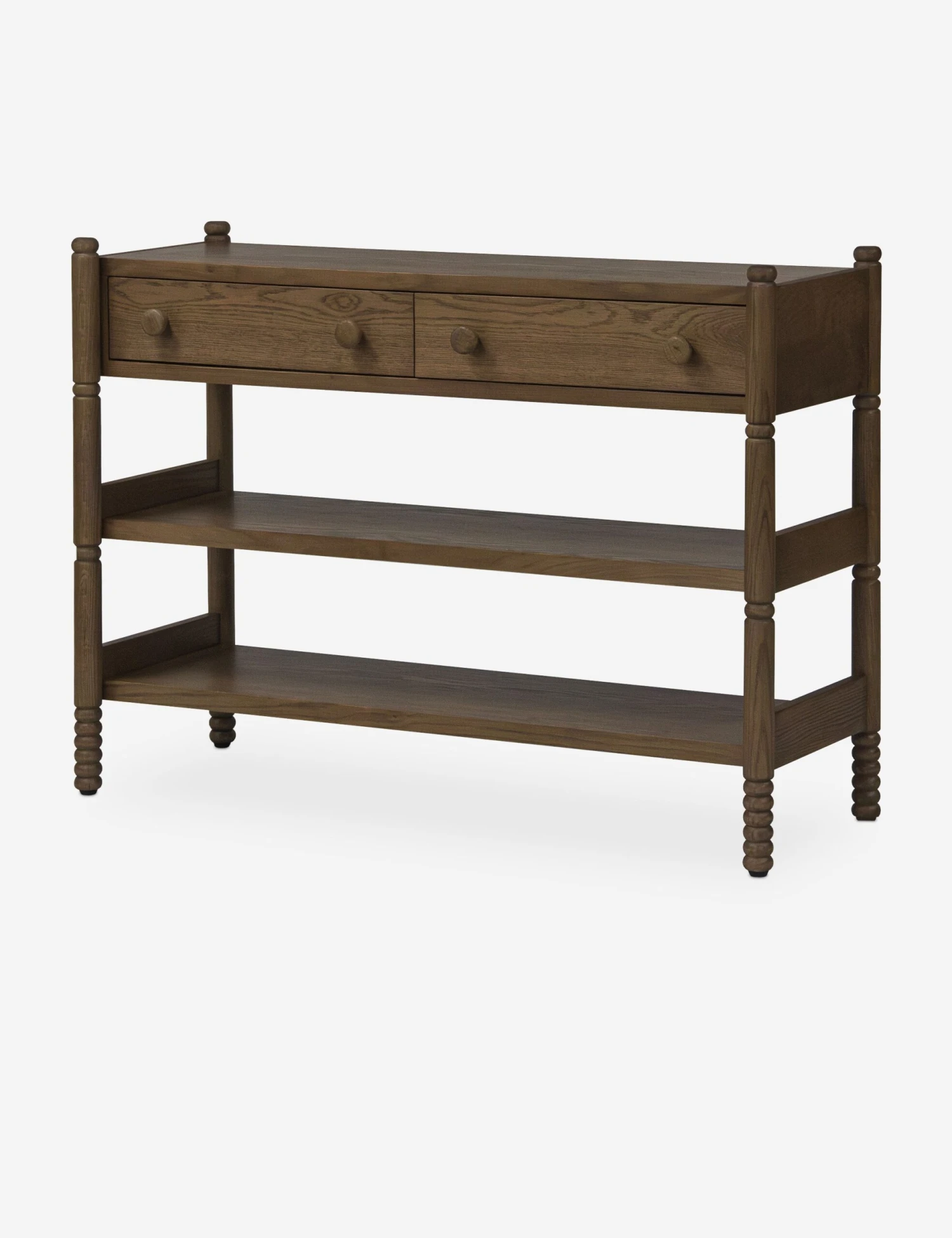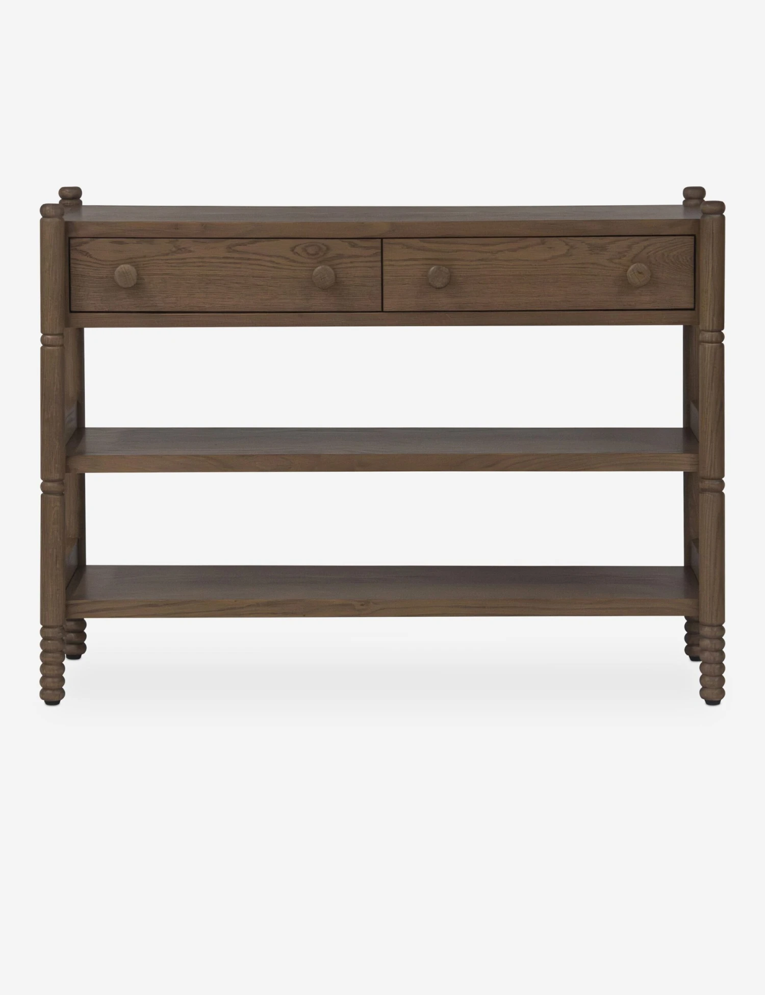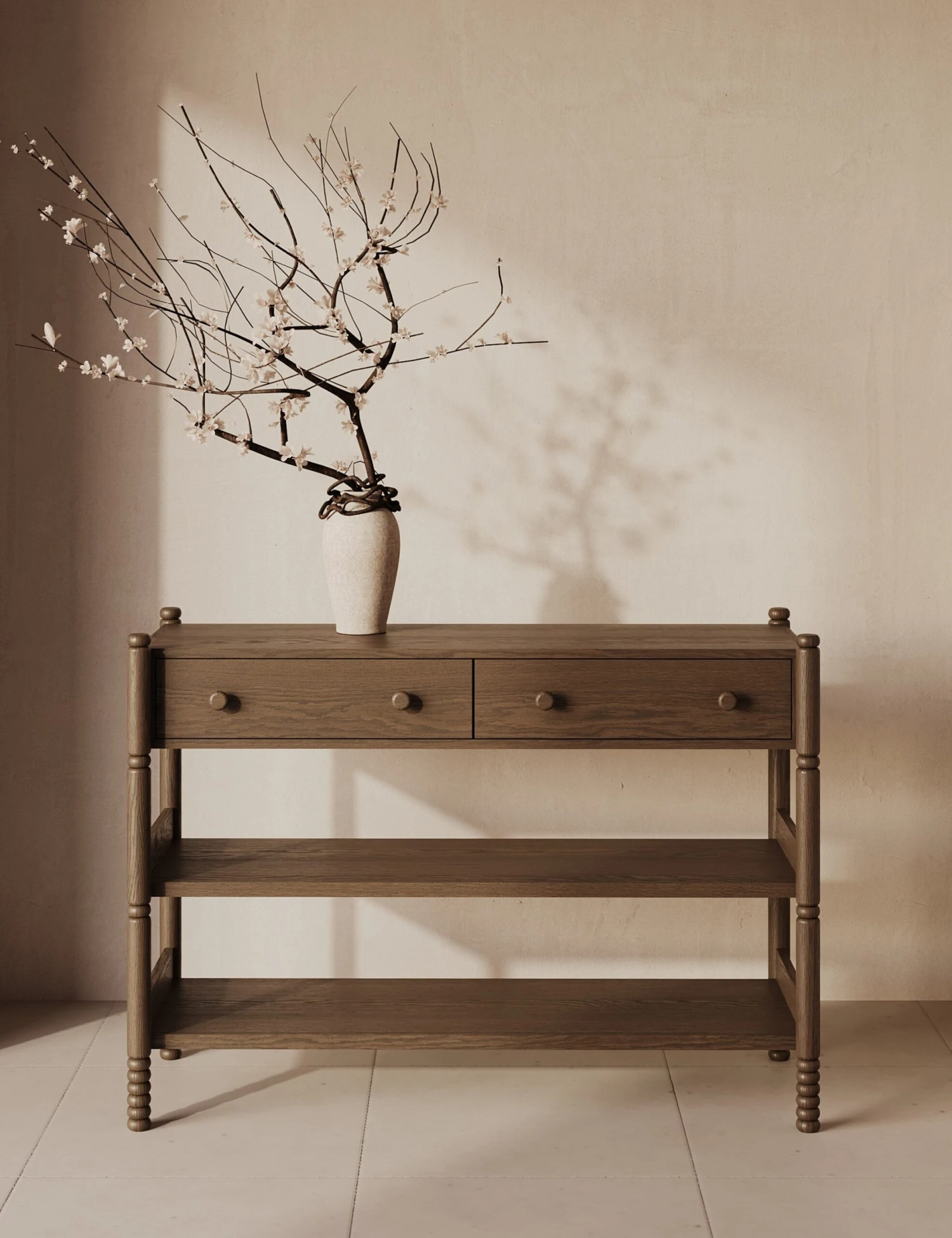 The Perth console table offers rustic warmth in a modern design. The solid, turned wood legs and oak-clad frame are covered in a rich, dark finish that shows the natural grain below. Two drawers with solid wood pulls and open lower shelving provide plenty of room for storage and decor, whether styled as an entryway table or living room surface space.