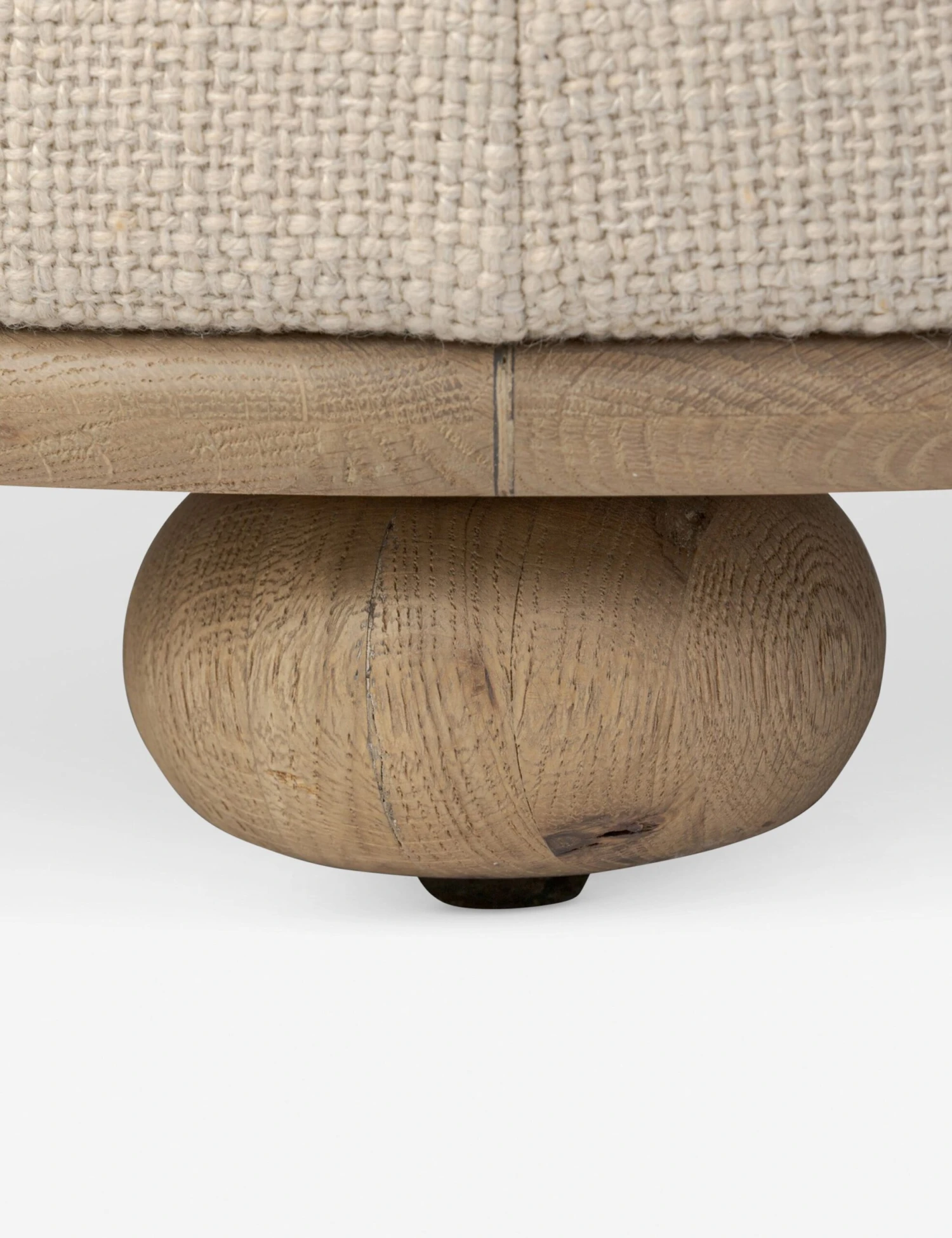 The Rajah round ottoman features a subtly tapered shape and oak bun feet for a soft, grounded feel. Whether styled as a small ottoman by the sofa or floated as a casual perch, it brings flexible comfort with a sculptural touch.