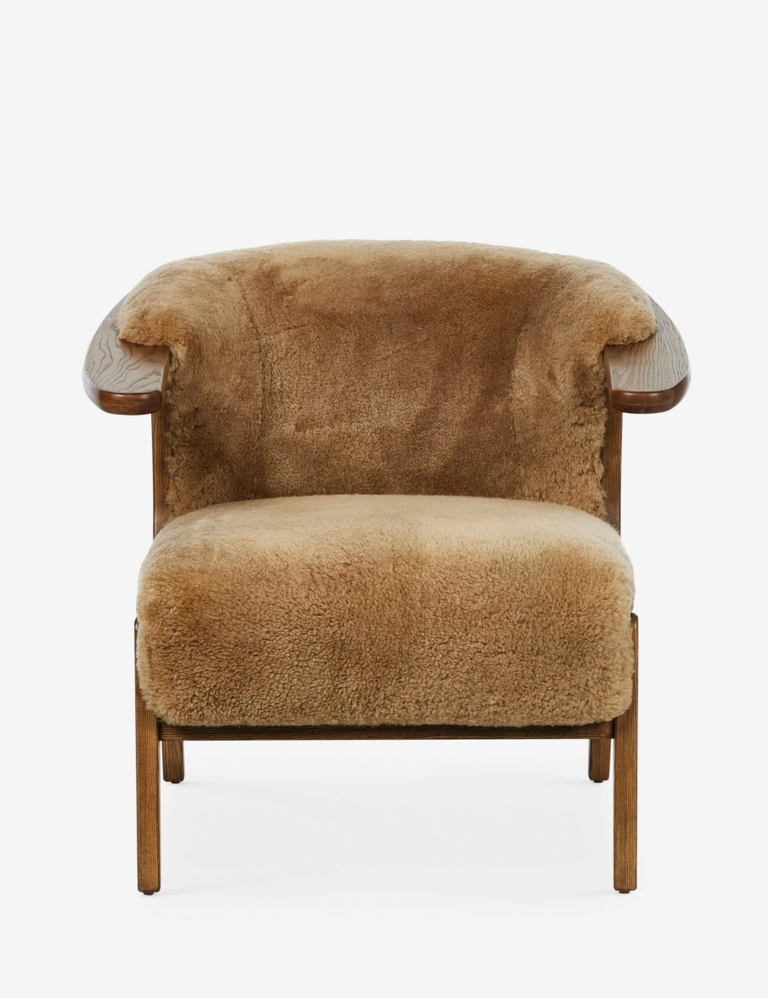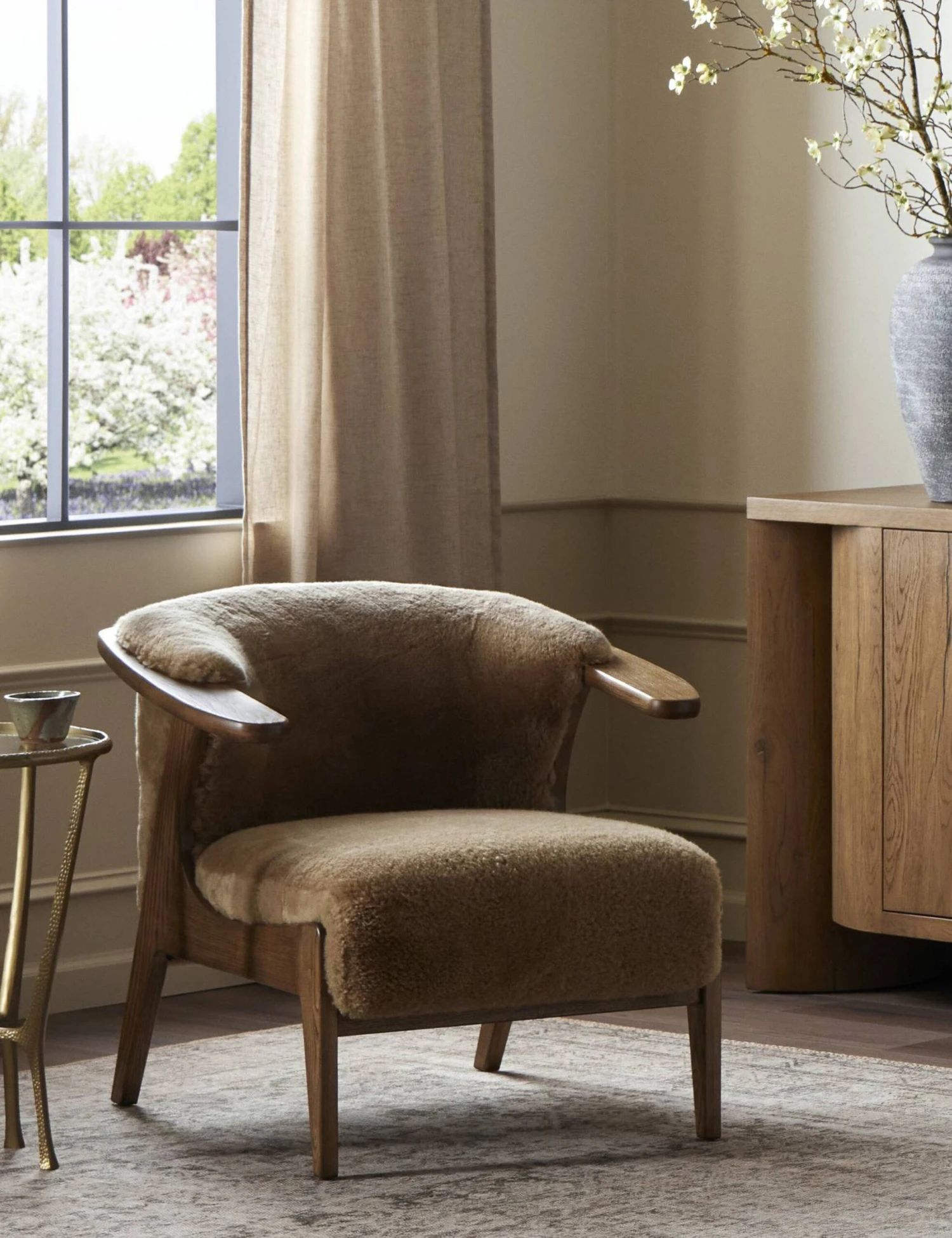 The Rebekah chair strikes a timeless tone with a subtle vintage character. Its paddle arms and cushioned shearling seat fashion a comfortable accent chair with a striking silhouette in the room. We love the warmth and texture of the materials for a richly layered space.