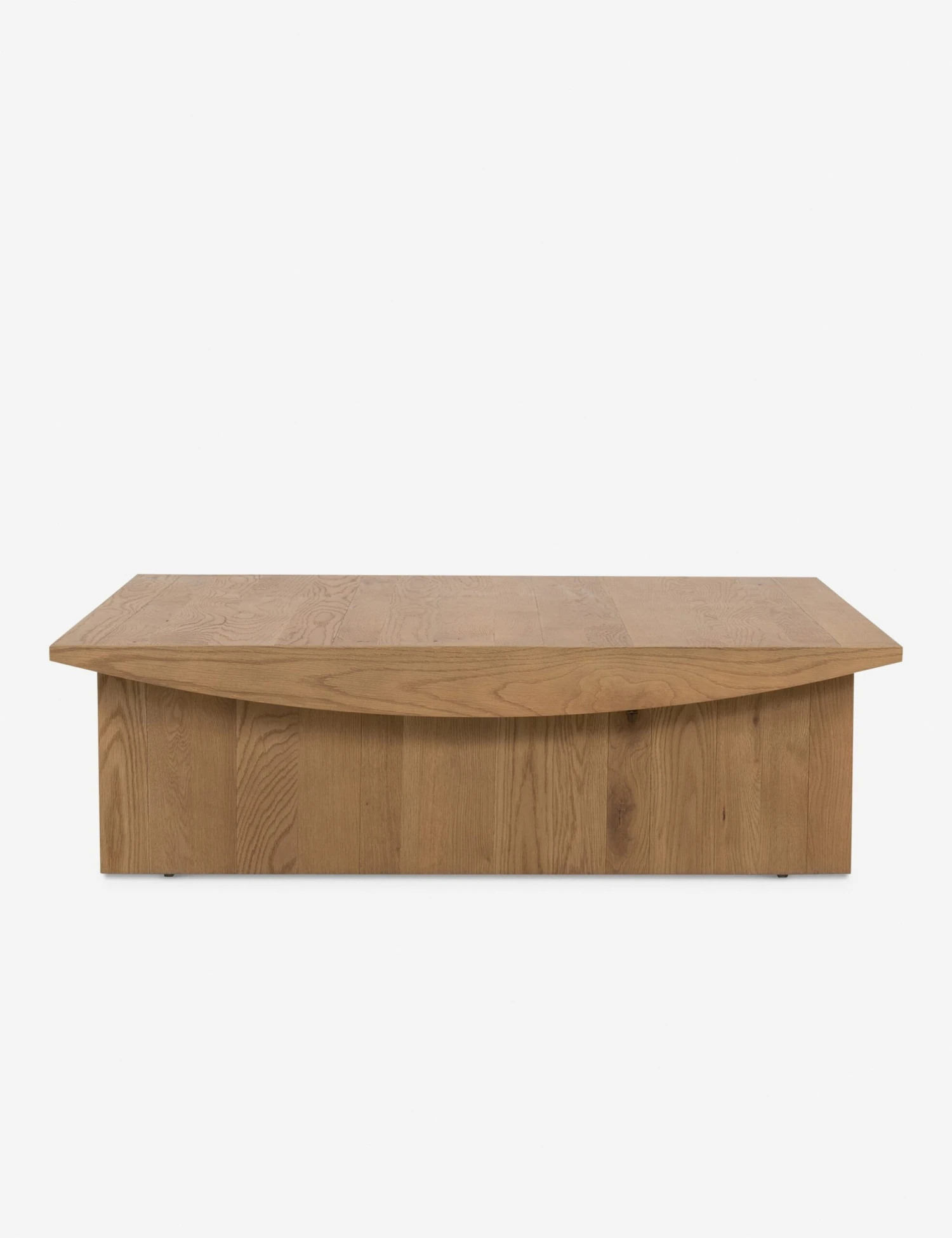Casting a clean silhouette, this square coffee table design is softened by a curved-bottom tabletop sturdily set on two flat, solid legs. Clad in a beautiful oak veneer for natural grain appeal, we love the warm and refined tone this wood coffee table offers to the center of a room.