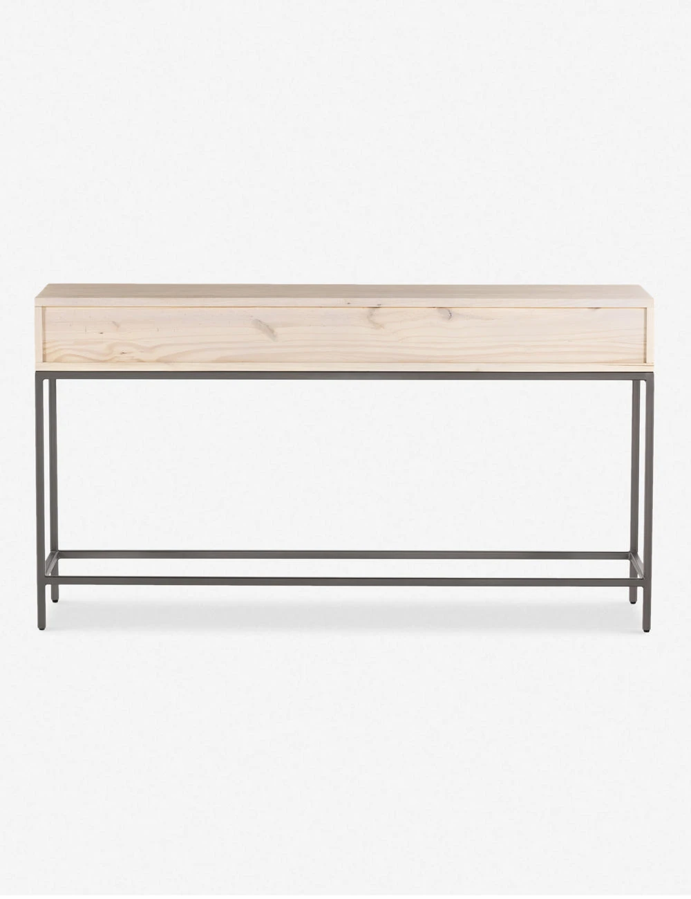 Keep your living space or entry grounded and modern with this sleek console table. With a beautifully essential silhouette, this poplar wood sofa table features elements of mid-century aesthetics like a slim iron base, top-grain leather drawer pulls, and an open shelf for an effortless touch.