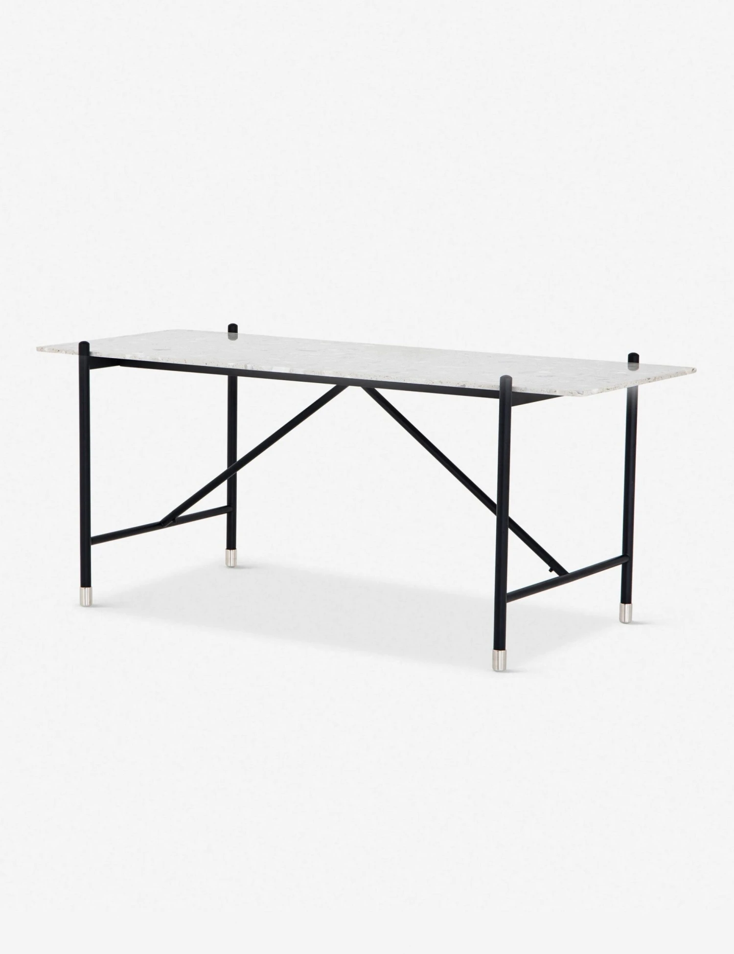 For the minimalist workspace, this modern desk is the perfect fit. Featuring a sturdy metal base with tipped feet, and angular accents supporting a contrasting terrazzo tabletop for a textured look.