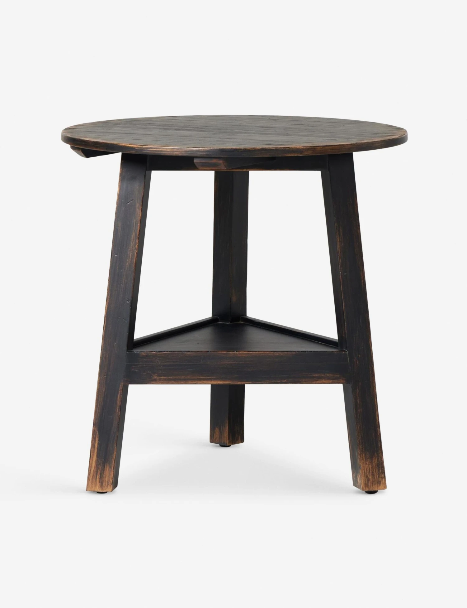 Distressing brings antique character to the black oak veneer on this charming side table. Its round top and triangular lower shelf are supported with three legs, adding a sense of artisan flair to an end table that can be styled with anything from a reading lamp to a vase of fresh-cut flowers.