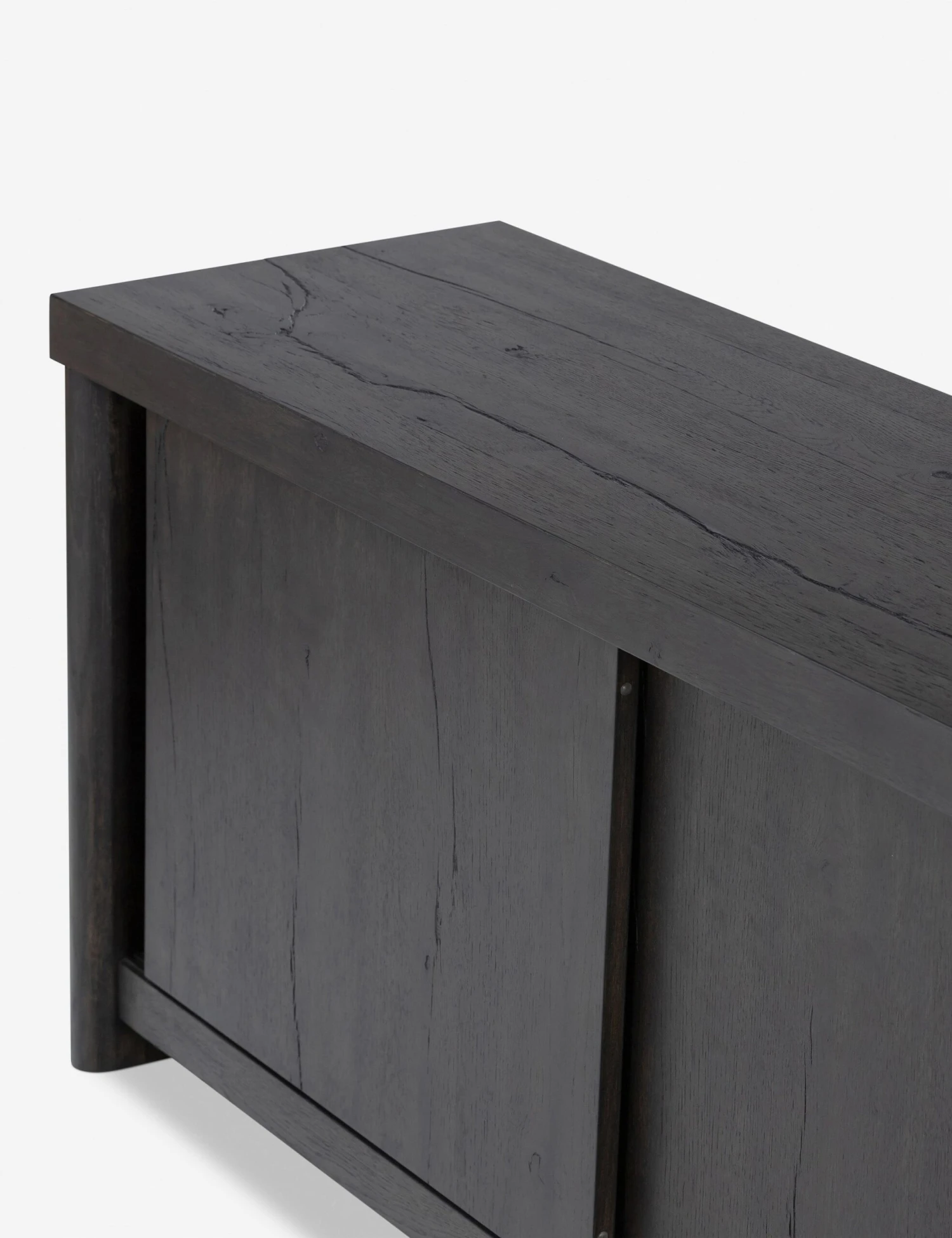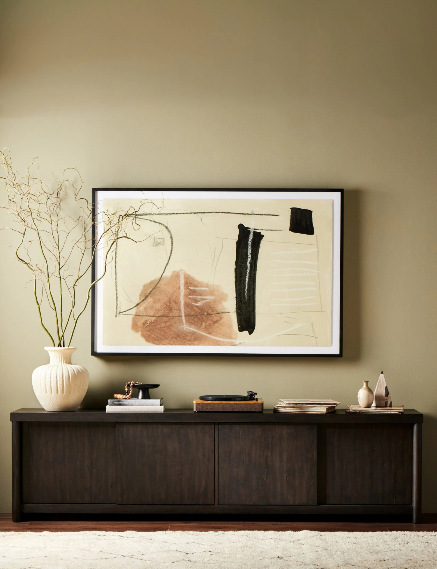 The Todaro media console grounds the room with understated elegance. Its dark-finished oak veneer features a weathered finish, adding patina and character to the sleek architectural lines. With the sliding cabinet doors and rear cutouts for cord management, you can fold all your modern elements into a timeless curation.