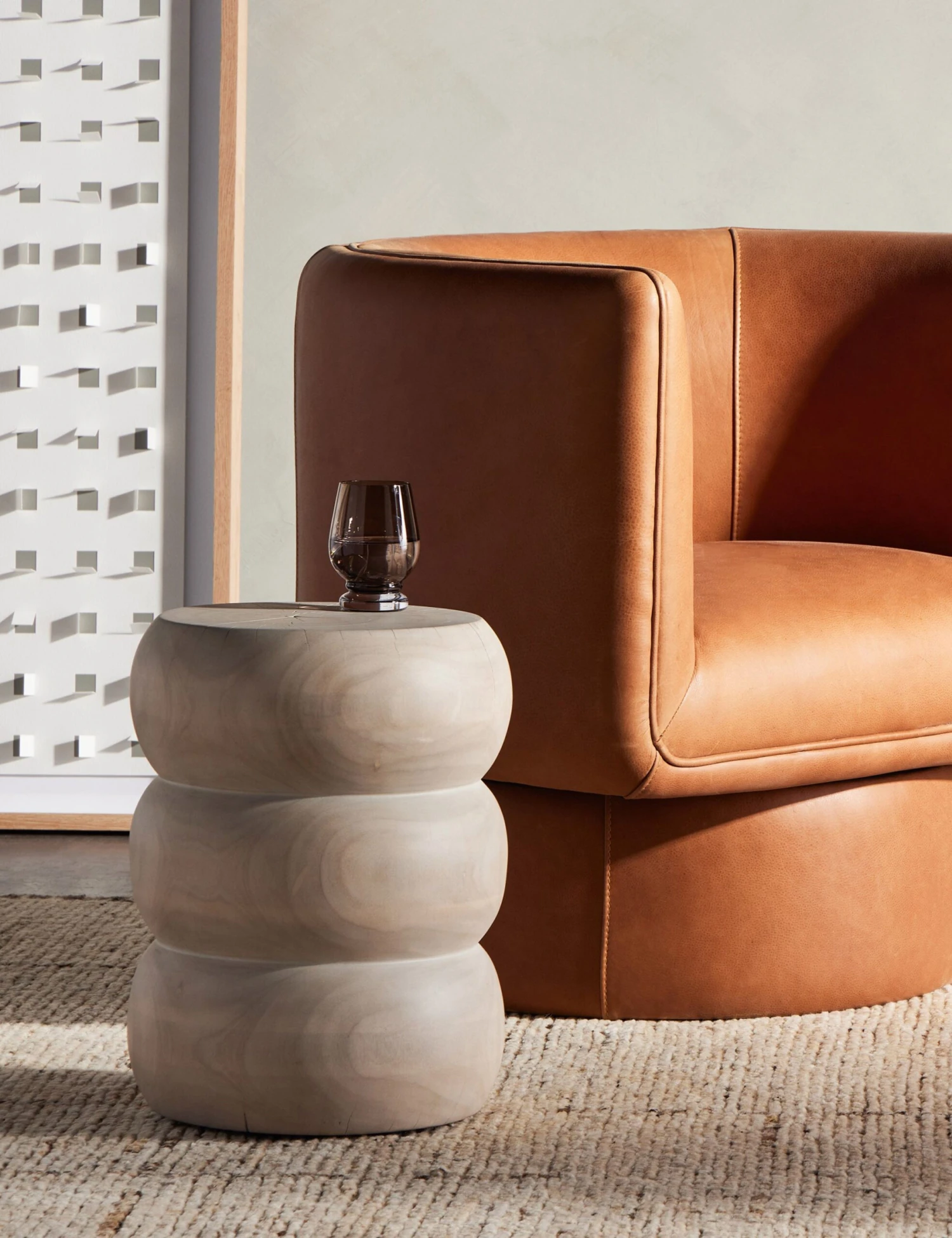 Sculptural lines and an ivory finish bring a soft impact to this side table. The form is carved from reclaimed wood, offering the warmth and character of the material. We love this end table for a practical accent in a chic and sunlit space grounded by organic elements and natural textures.